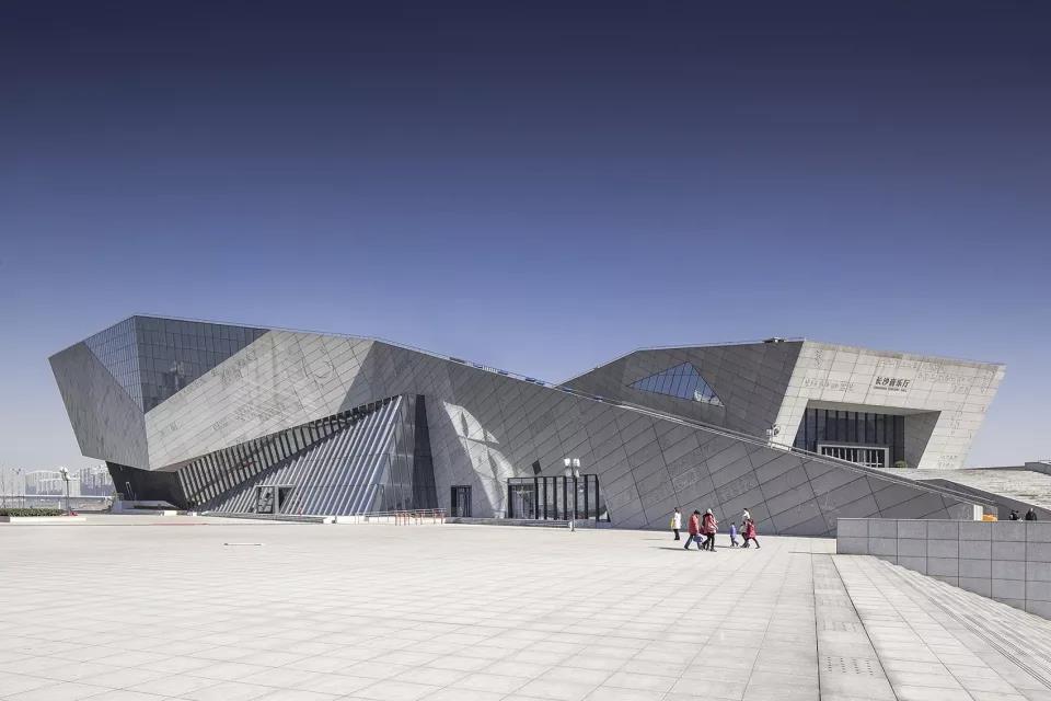 音樂廳總建筑面積28161㎡,巨大的懸挑體量,形成一種如揚(yáng)帆起航的巨輪一般向江面行駛之勢(shì)。音樂廳外墻采用紋樣1m*3m的混凝土掛板,采用中國古樂“瀟湘水云”減字譜以及西洋五線譜號(hào)作為外墻紋理,體現(xiàn)古今旋律與中西音樂交匯于此的深刻含義。