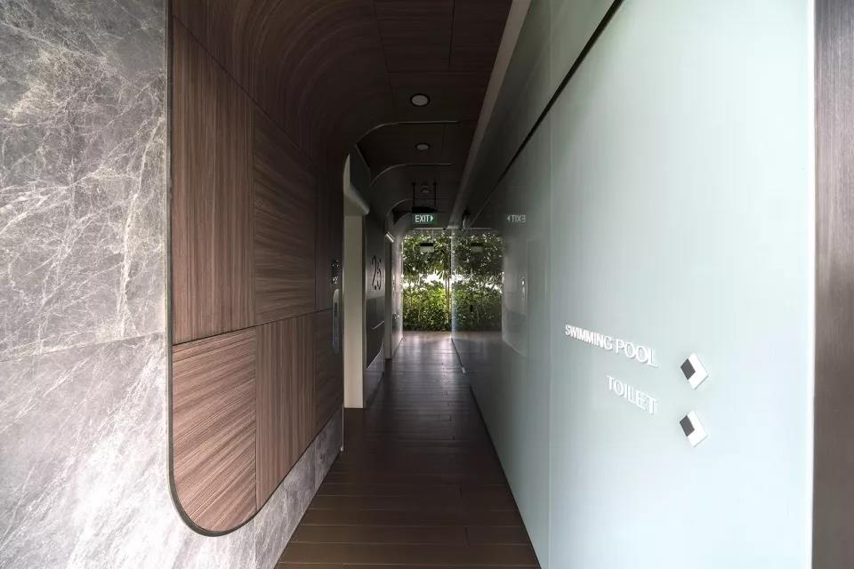 青翠的景觀連接了公共戶外空間,而塔樓升降機大廳通過使用天然材料來引入自然景觀到室內。大堂空間主要以柔和的木制線條和優雅的大理石地板飾面以強調自然元素,其余部份則采用油白玻璃以反映和擴大空間。大理石磚(90×90厘米)以隨機圖案布置在地板上,并延伸到大堂墻身,藉以以擴展視覺空間。