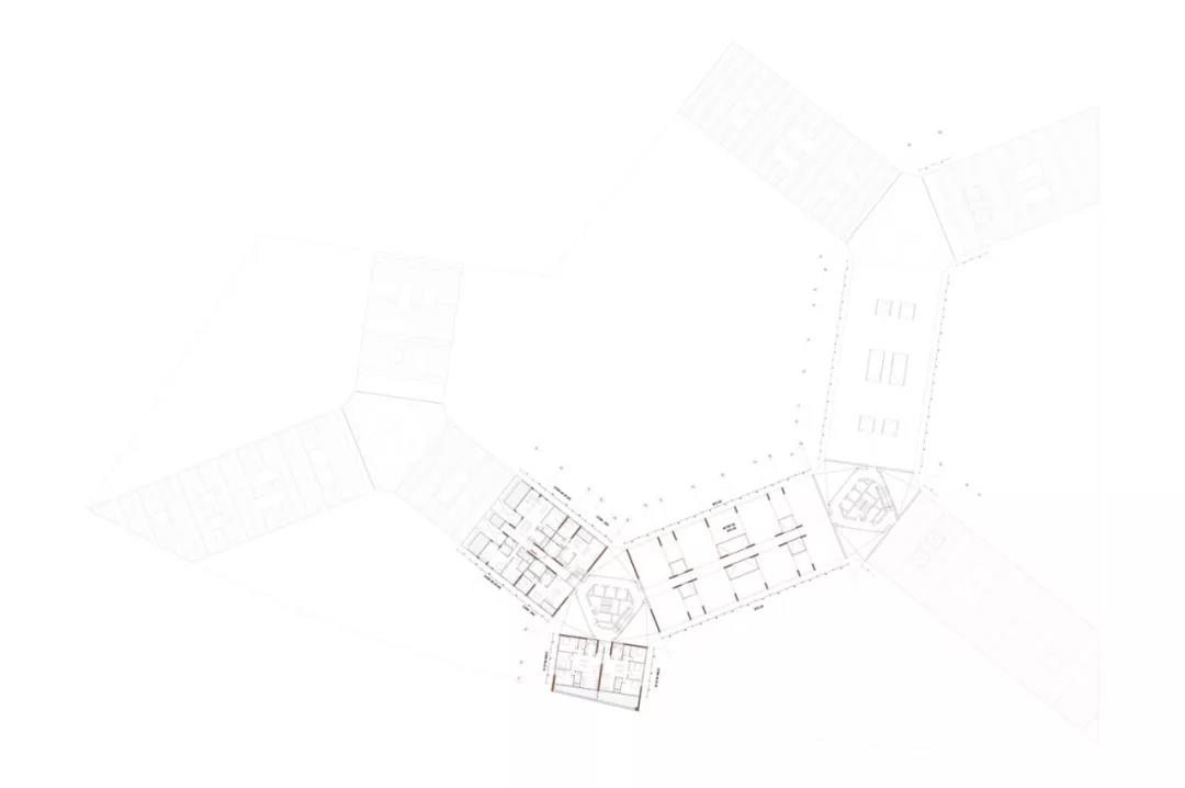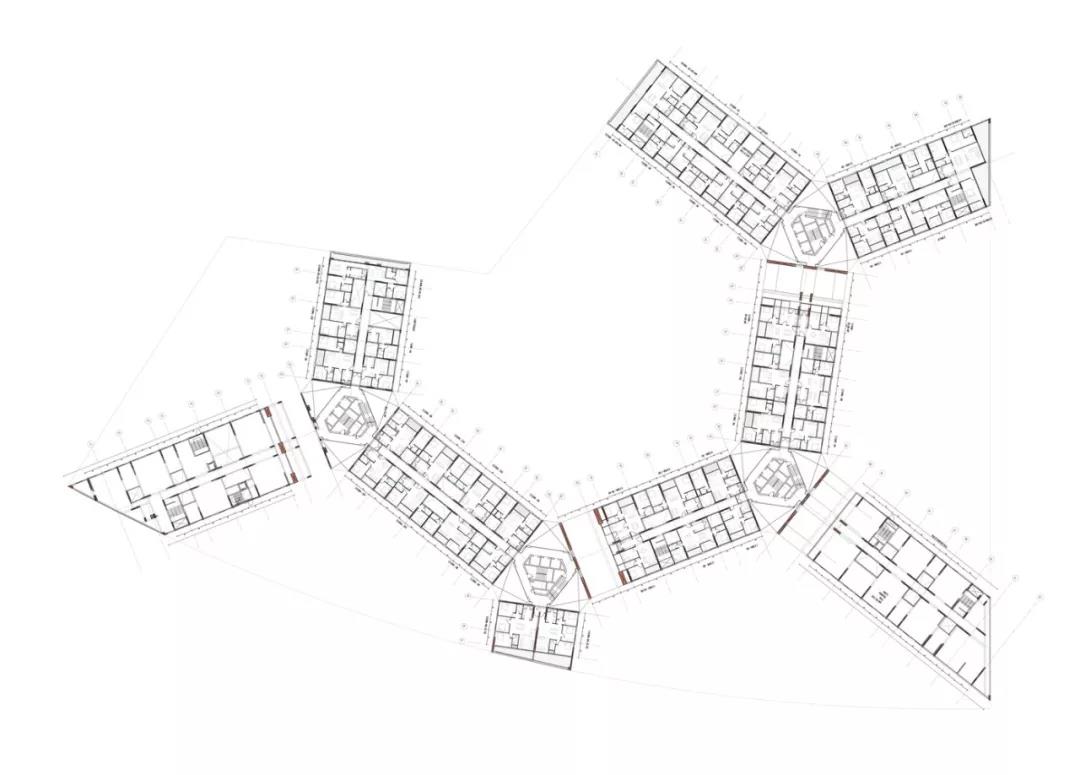 六角形的體量使公寓擁有廣闊的視野,并在底層圍合出一個開放的大型公共庭院。“山峰”可以優化日照條件,由此產生的傾斜屋頂能夠提供私人和公共的露天平臺。主立面混合了正常大小、兩層高、兩層寬,甚至L形的露臺,已經暗示了住宅的多樣性。被稱為“穴”的大開洞,色彩鮮艷,進一步突出了由露臺創造出的強烈圖像化的外觀,這些開洞穿透建筑的立面并與中央走廊相連,提供了公眾聚會的空間和公共空間的對流通風。這些空間為滿足長廊消防規范并提供避難空間的需求而設計,有助于賦予建筑的不同區域一種“鄰里認同感”,每個開洞都被設計為容納不同的活動(如瑜伽或迷你高爾夫)或不同類型的居民(如青少年或幼兒)。