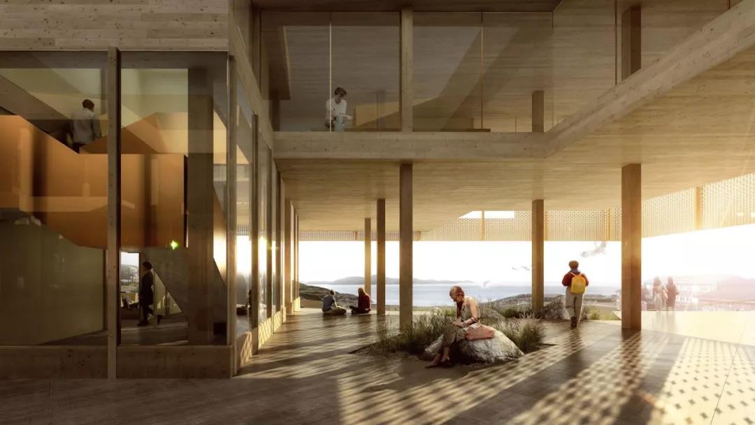 在設計這個35,521平方英尺的建筑時,White Arkitekter設計團隊選擇強調格陵蘭島自然景觀的美麗,并營造出與醫(yī)院周圍環(huán)境緊密相連的寧靜氛圍。通過分析和認識建筑對醫(yī)院病人的影響,設計團隊試圖為病人創(chuàng)造一個平靜、治愈的環(huán)境。