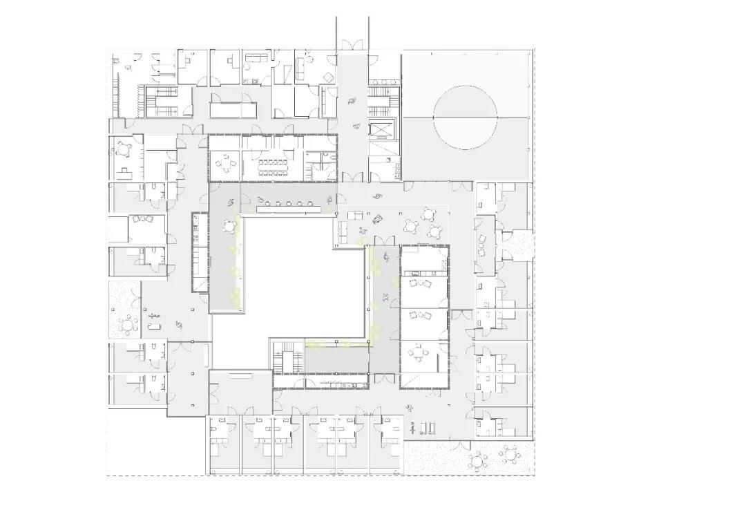 整個建筑的許多主要聚集區(qū)域,如中庭,將作為過渡空間,將封閉空間的防護與景觀的美麗清晰融合起來。這些靈活的空間適合各種活動,包括家人和朋友的訪問,鍛煉和個人反思。