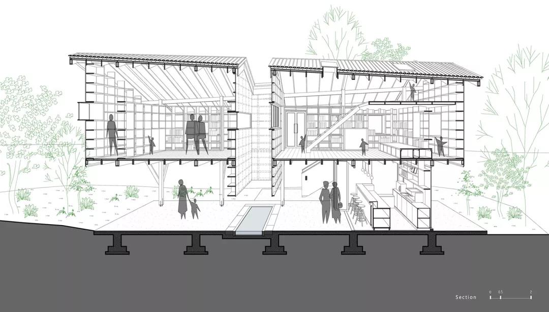 同時站在場地關系的角度思考,書屋用地處于一個三角地帶,南側是該村落的主要步行干道,北側有一堵三米高的石坎墻,石坎墻上面是一片兒童戲玩區,在設計策略上抬高書屋的實體空間部分,讓建筑體首層與道路之間形成空間的退讓,路上的行人也可以隨時到書屋下休息。而書屋的二層則和兒童戲玩區在同一空間層面上,這樣的處理,一方面便于兒童進入書屋看書或者在兒童區玩耍,另一方面,方便父母在書屋里閱讀的同時能關注到孩子。