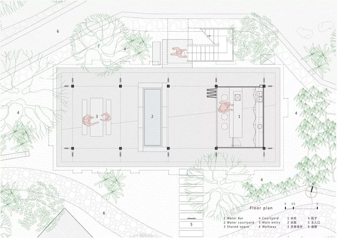 把書屋的一部分空間留給村民,是我們設計初始階段就有的想法,也是一種直覺性的感受,在書屋的首層做一個架空的半室外開放空間,用十根結構柱架空整個書屋首層,實體空間都設定在二層,兩個空間通過一部室外樓梯進行連接,只在首層局部設置了一個小水吧,可以提供水飲,其他的空間完全公共開放,山里的村民們可以在此喝茶聊天,小孩們也可以在這個空間玩耍打鬧,用這個開放空間把各種活動的可能性都串聯起來。