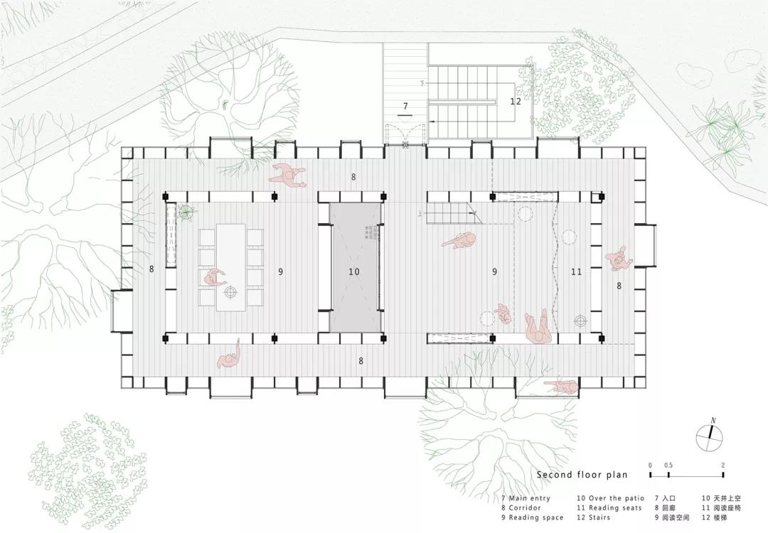讀者漫游于回廊時,視線和空間通過洞口突然被打開,空間的邊界便消隱了。當人站在洞口的另一邊,透過窗口,不但能看到坐在窗臺上看書的人,還能看到更遠的窗外,遠處的山林和大樹。通過屋內層層遞進的******感能產生空間與人,與環境的交流和對話。