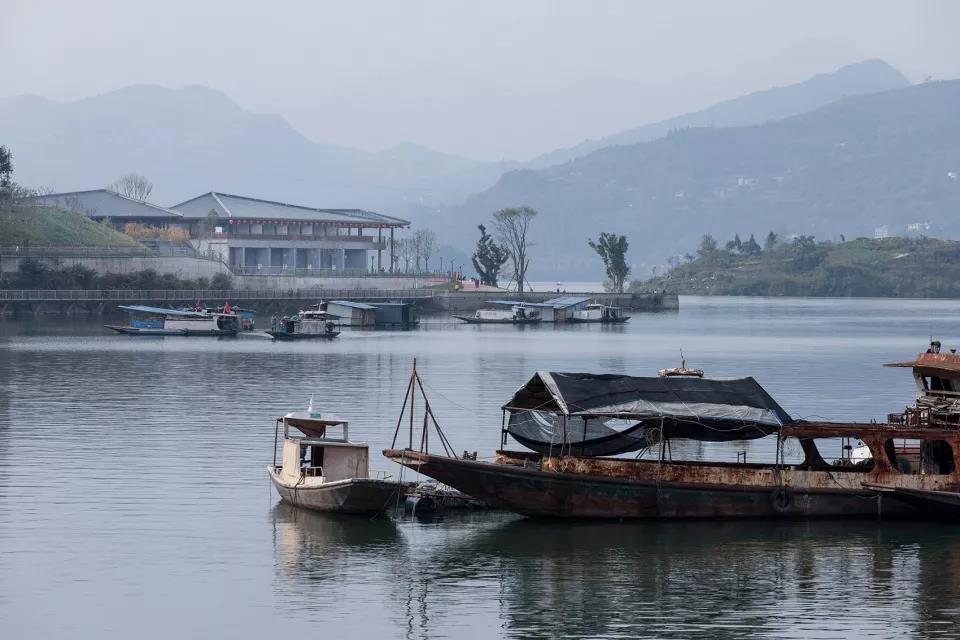 澎溪河寬闊的河面上,遠處的層疊山脈延伸入江水中,在基座之上,四方井服務建筑的坡屋頂沿著江面漂浮展開,融入遠處山峰的輪廓。