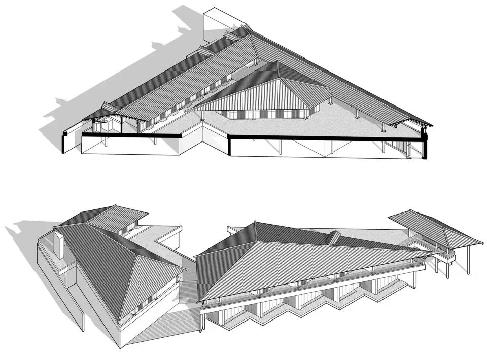 設計對“四方井”這一概念進行抽象變形,將建筑形體整理為順應地勢地形的一個多邊形院落。進一步對屋頂進行切割,將完整的屋面打散成數種不同的傳統坡頂形式,并在面向澎溪河的界面形成兩個開口,成為下沉庭院和觀景平臺。