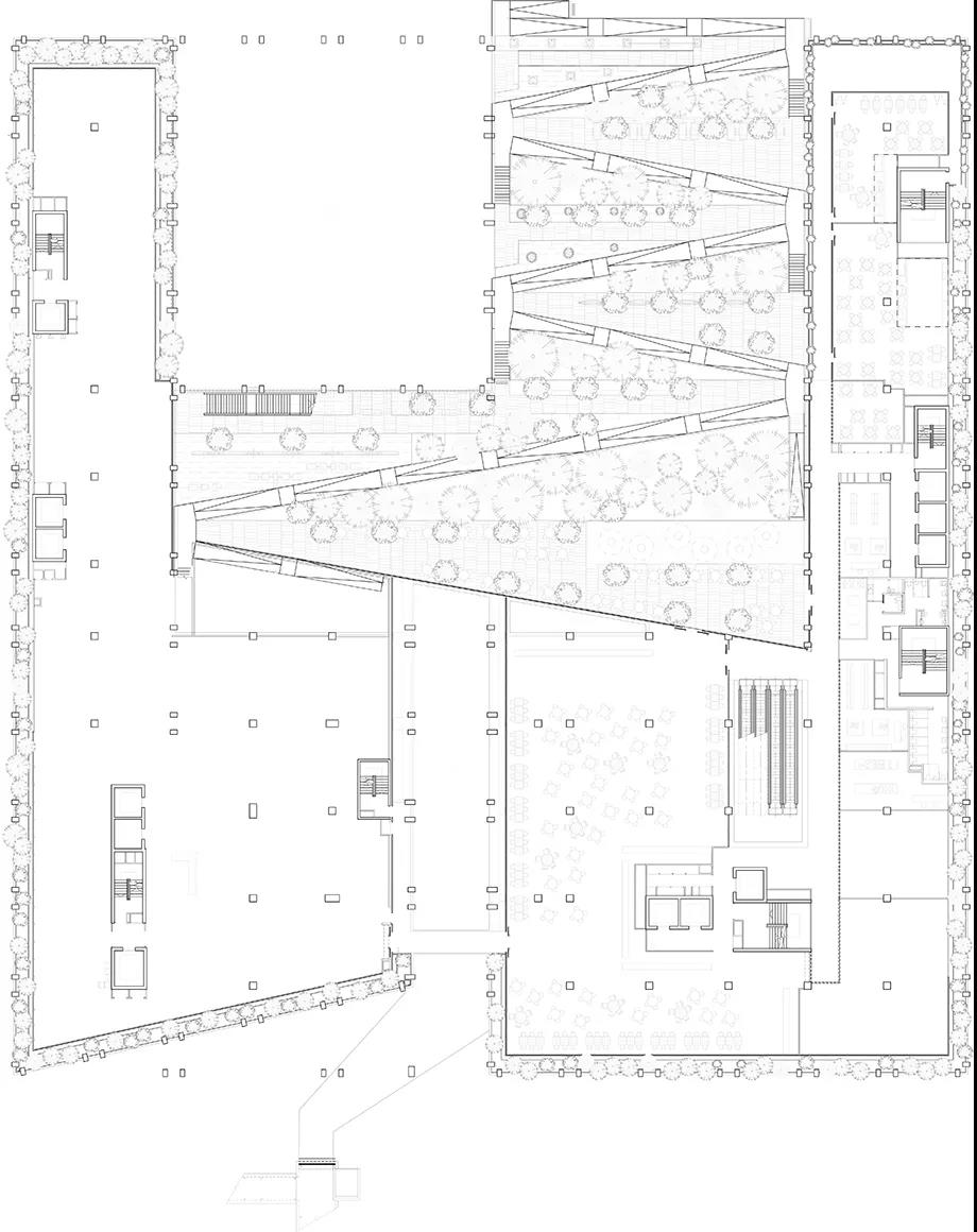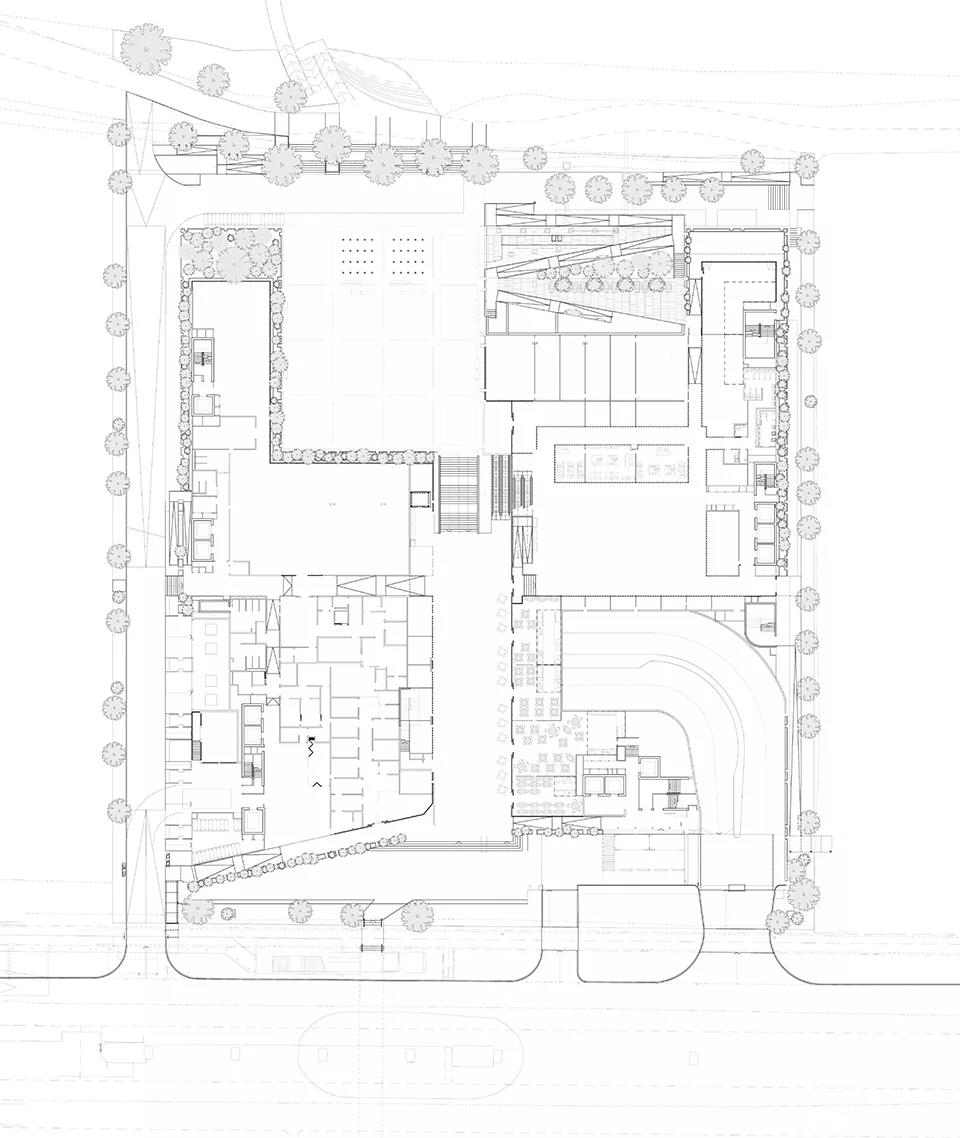 餐廳、教學(xué)中心和綜合醫(yī)院等空間共同俯瞰著公共花園,并且直接與花園平臺相連。人們可以直接在戶外花園中用餐。綜合醫(yī)院的等候區(qū)也同樣享有花園平臺和水岸的優(yōu)美視野。