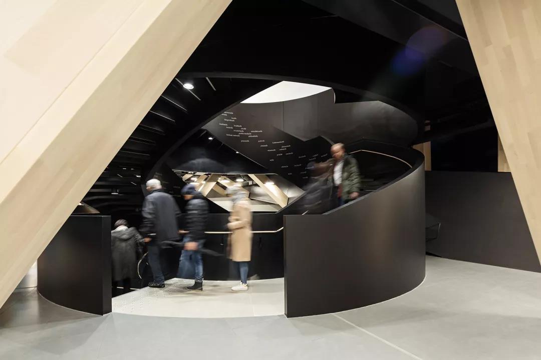 具有雕塑感的木制拱形元素如橋梁般延伸在首層空間上方,這一創新性的解決方案使無柱空間得以實現,并最大程度地提高了建筑的可達性和功能空間的辨識度。