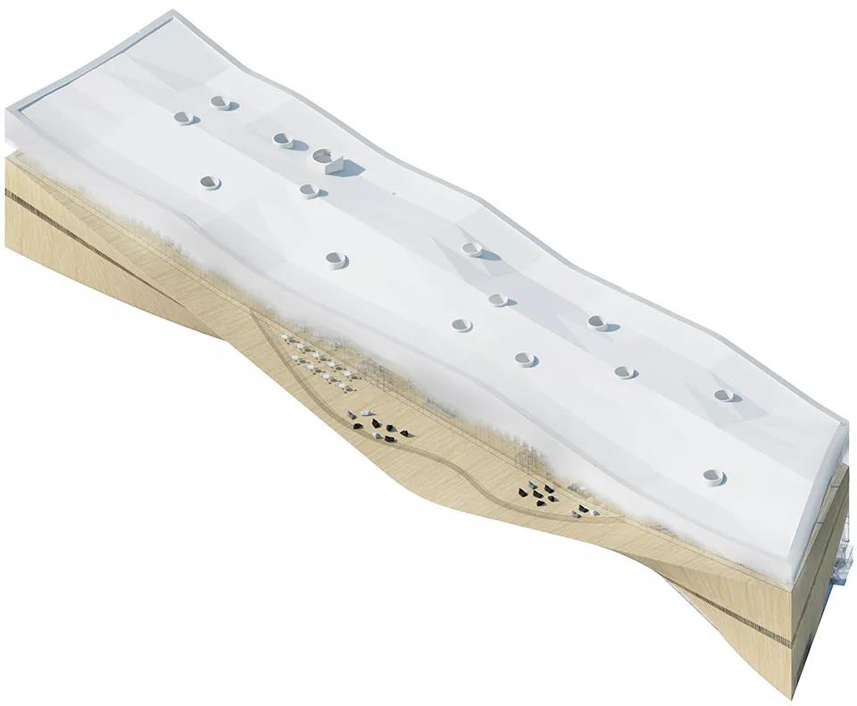 設計概念以三個獨立的公共樓層為基礎,通過在首層空間上方置入跨度超過100米的不對稱橋梁結構而得以實現。該橋梁結構由鋼桁架和鋼梁構成,并由兩個巨大的拱形鋼結構提供支撐,其外部包覆以鋼筋混凝土張力板。