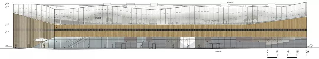 拱形的木制體量在朝向市民廣場的入口上方形成一個巨大的頂篷,在帶來有頂室外空間的同時,也將地面餐廳等功能空間擴展至廣場上。