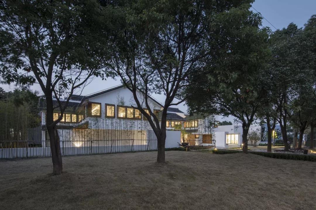 在舊建筑前加建四組角部相連的坡屋頂房子,圍合出四組互相連通的院落,空缺處形成兩層貫通的天井,讓上下層空間在多處相連。在新建部分做一層挑檐,降低尺度,并定義出一層的室內外的連通空間。建筑南側的樹木和田地自然流入院內直至室內,進一步挑戰既定的建筑院落內外關系。