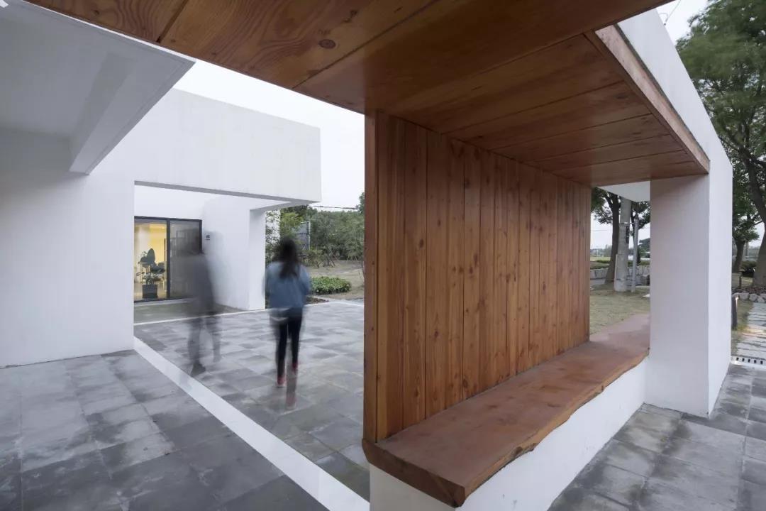 入口處通過院墻的開口與鋪裝的邊線界定出既屬于院內,同時屬于院外的空間。主庭院與入口庭院之間設計了一個雙面廊,兩側都可坐人,角部打開形成一個可容一人通行的門,門向側面一拐變成與人眼齊高的窗,可以從院外窺向院內;門向下一卷又形成了跨在水面上的橋,供人通過。這樣一個是廊,是門,是橋,又是窗的構筑容納了坐、窺、行等幾組行為,為兩個院子之間的連通提供了不同方式。