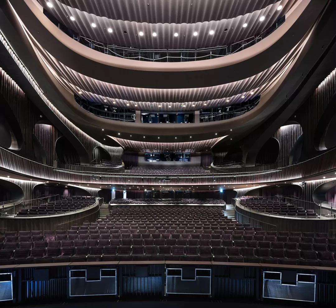 作為戲曲中心的核心地帶,大劇院巧妙地“懸浮”在首層空間上方90英尺(27米)的位置,從而將禮堂與喧鬧的城市環(huán)境分隔開(kāi),避免了噪音帶來(lái)的干擾。