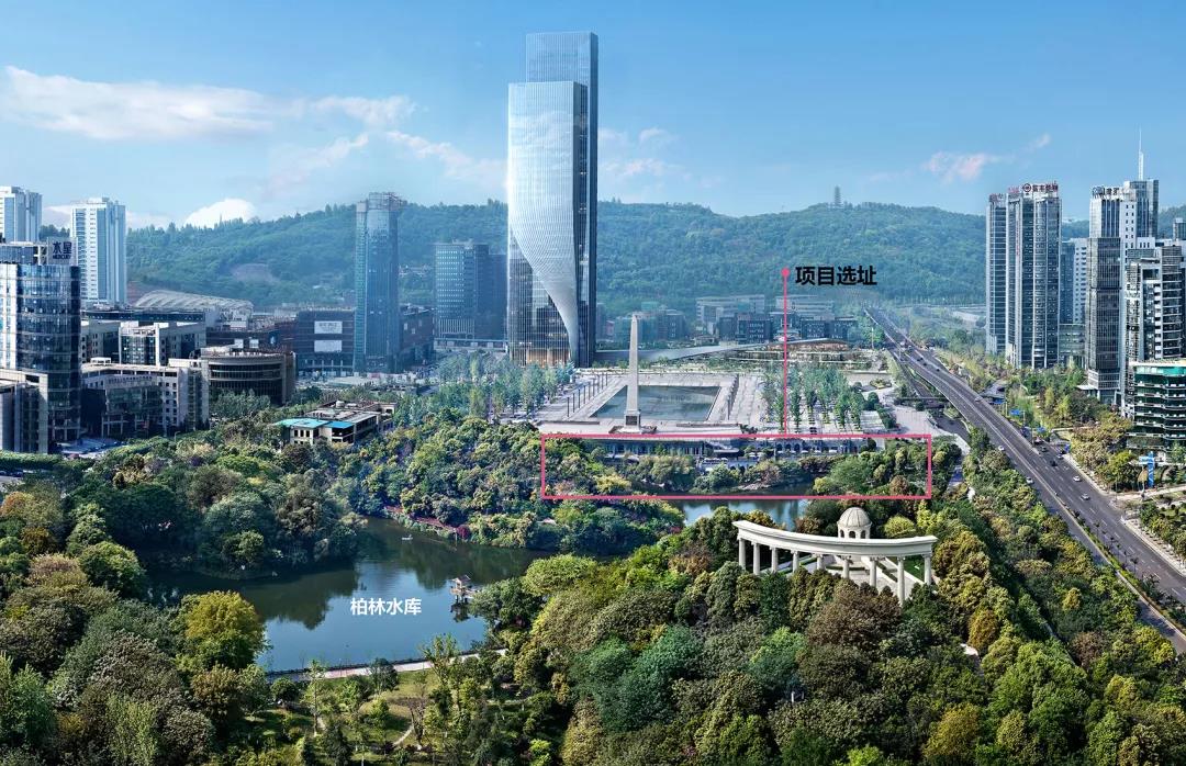 項目用地位于照母山科技新城中央的幸福廣場南側,正好在方尖碑的下部,毗鄰柏林公園,看山面水。建筑原為一家停業數年的飯店,為迎接2018年8月下旬在重慶召開的智博會,展廳項目選址于此。