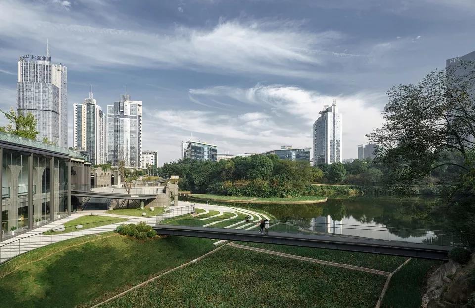 整體交通上采用無障礙景觀橋和退臺式生態草階的設計手法將存在高差較大的區域聯動起來,構筑多層次的景觀空間場地。