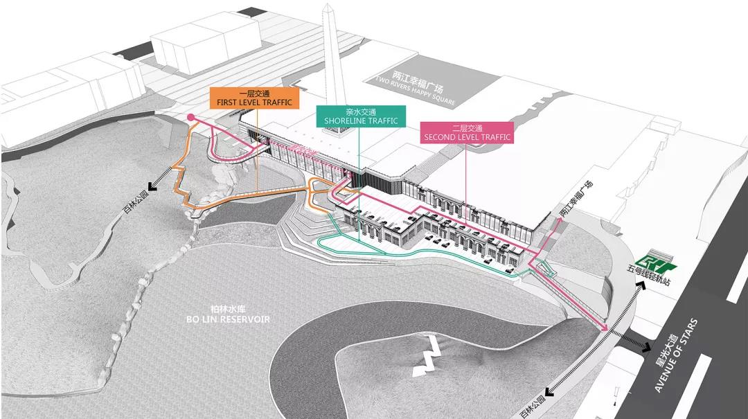 游廊串聯體系分析圖,坡道連接室內建筑與濱水景觀區