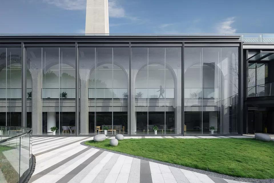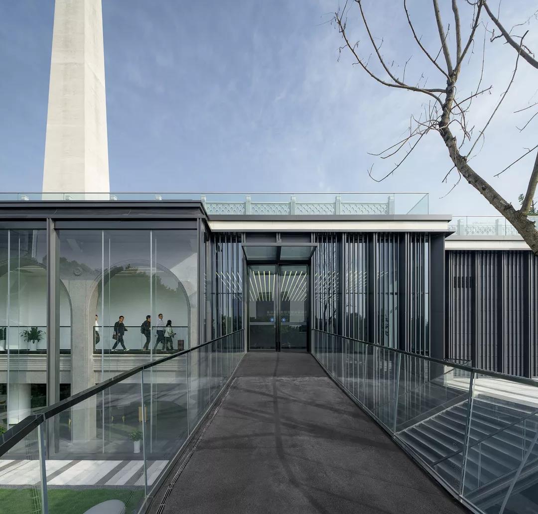 改造后的建筑立面,采用“外罩”玻璃體的方式進行風貌轉換