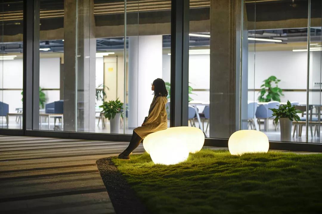 放置于草坪上的景觀置石小品采用石材質感透光PE材料,白天可以作為景觀坐凳,夜晚則是獨特造型的景觀燈