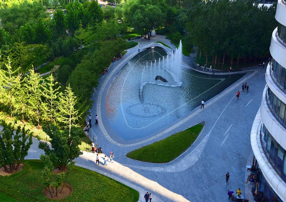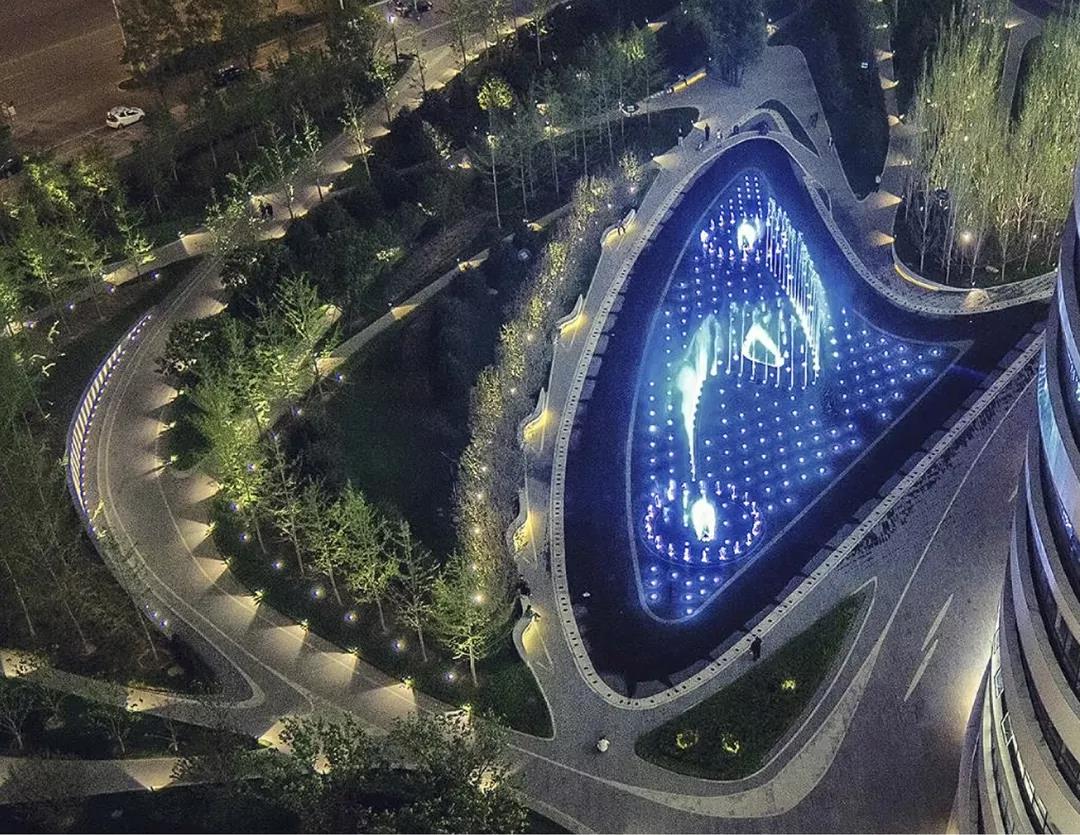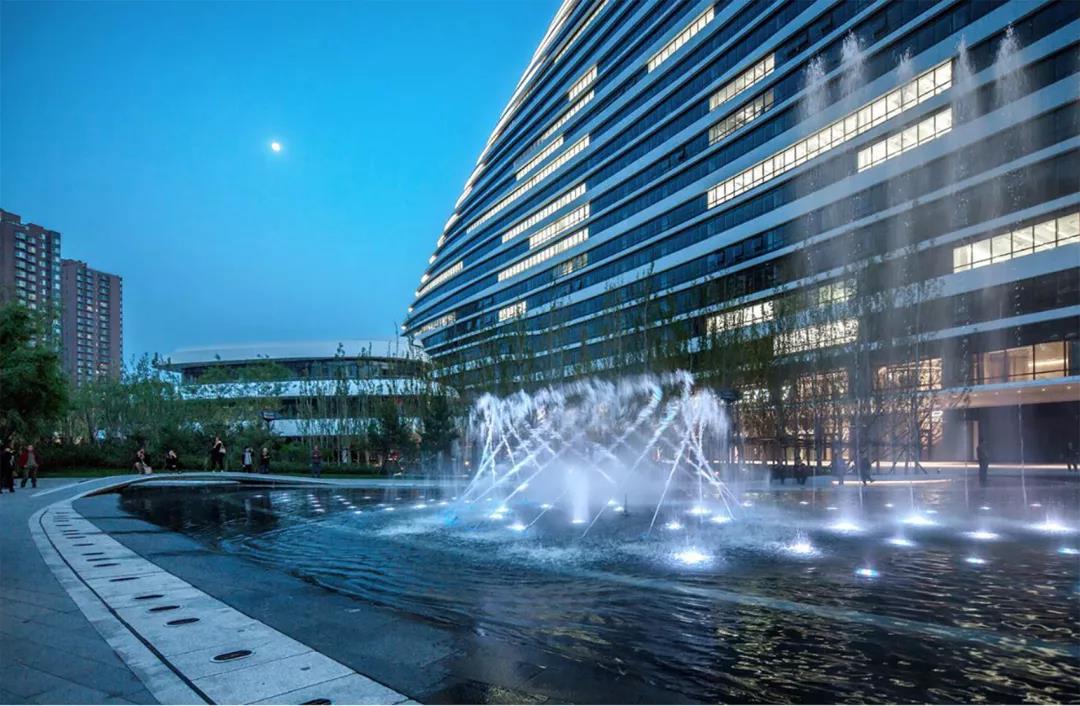 水景由外側(cè)拋物線泉、中心跑泉以及位于水面中央、由30米高氣泡泉組成,配合韻律感極強(qiáng)的樂(lè)曲和炫彩奪目的夜景燈光,水柱則按照設(shè)定程序伴隨著起伏的旋律,將藝術(shù)與科技完美締合,打造了動(dòng)靜相宜的辦公休閑空間。