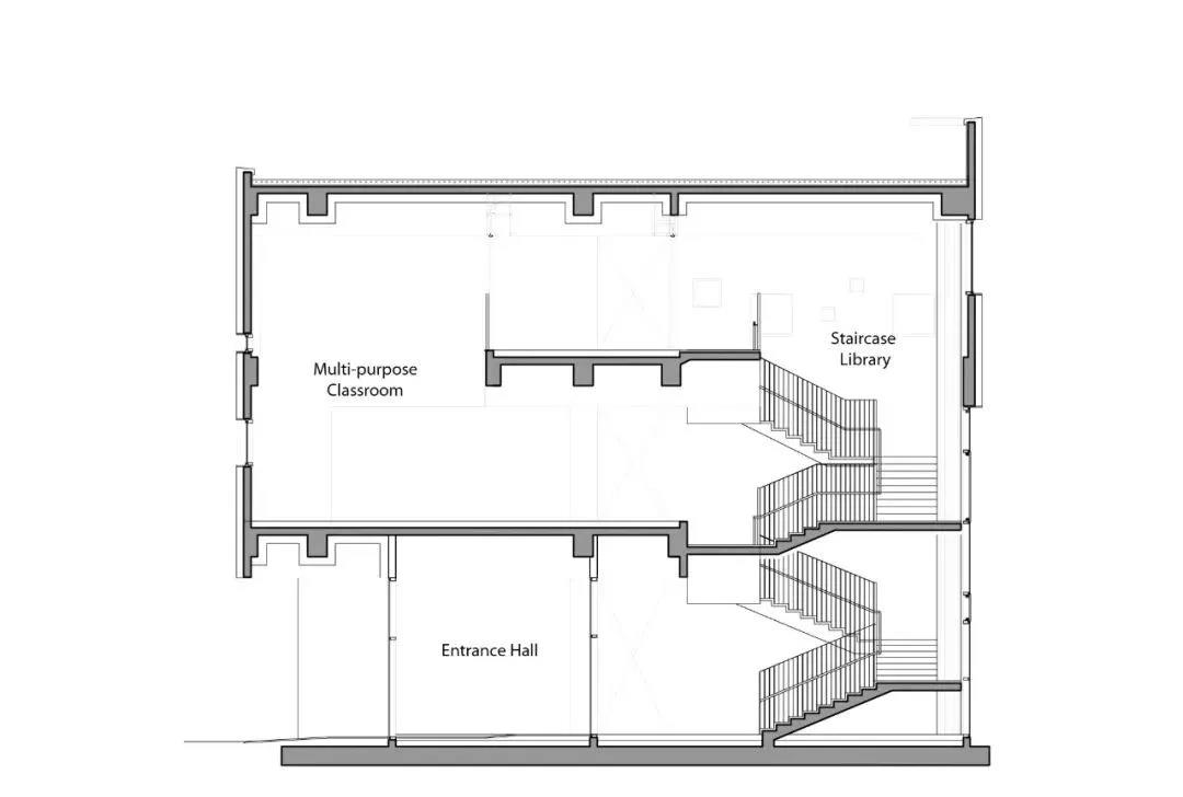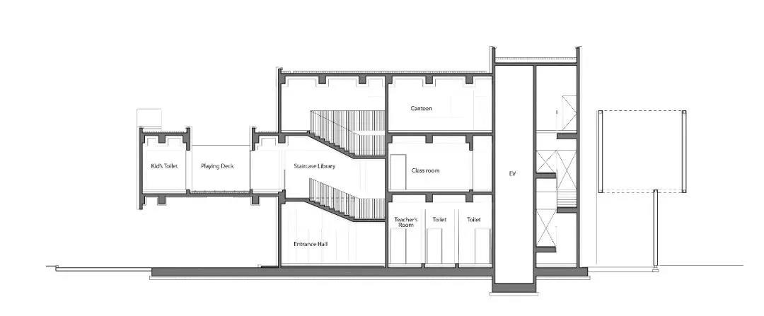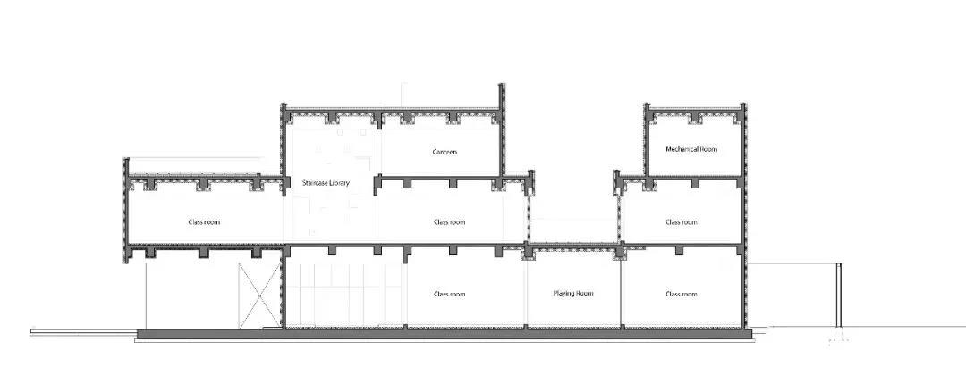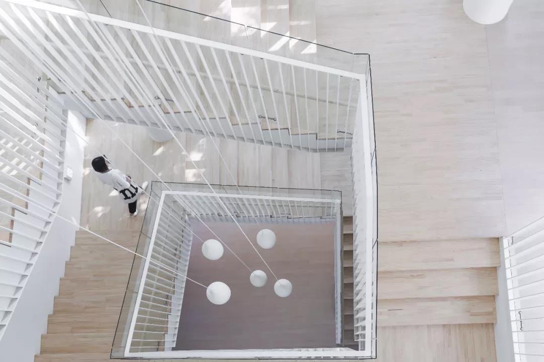 基本單元從教室開始,最終轉(zhuǎn)化為各種戶外空間,如空無一物的天井、露臺、室外操場等,形成了類似于攀登架的滲透組合空間。為了避免建筑的某些形狀,建筑附加了無屋頂?shù)牧⒎襟w,以鼓勵孩子們尋找開闊的風(fēng)景、天空和想象力。而透明的玻璃立方體組成的主要交通流線被設(shè)計成“他們的甜橙樹”,展示了一起生長的想象,感受大自然的活力。