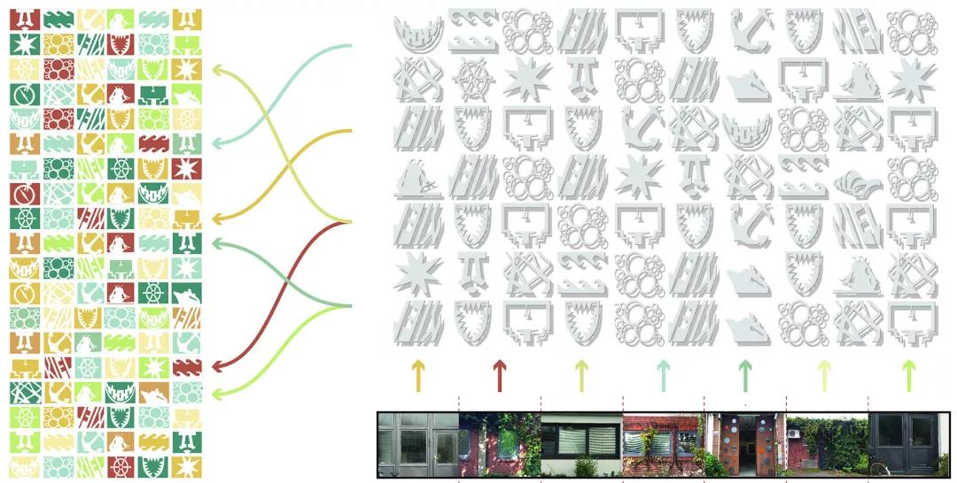 由纖維增強(qiáng)混凝土制成的立面面板是該項(xiàng)目最引人注目的元素,它被置于窗前,向人們展示各種匯集當(dāng)?shù)鼐用駝?chuàng)意的圖像標(biāo)志。