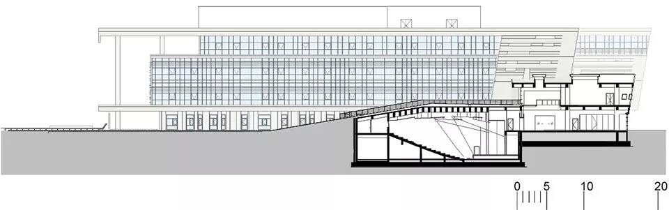 較矮的翼樓主要容納了社交空間,并將主要的體量連接起來。它呈南北向布局,進一步強調了與之相鄰的林蔭道的連續性。