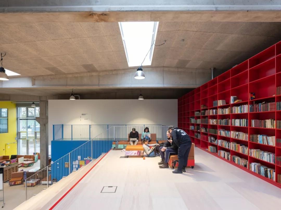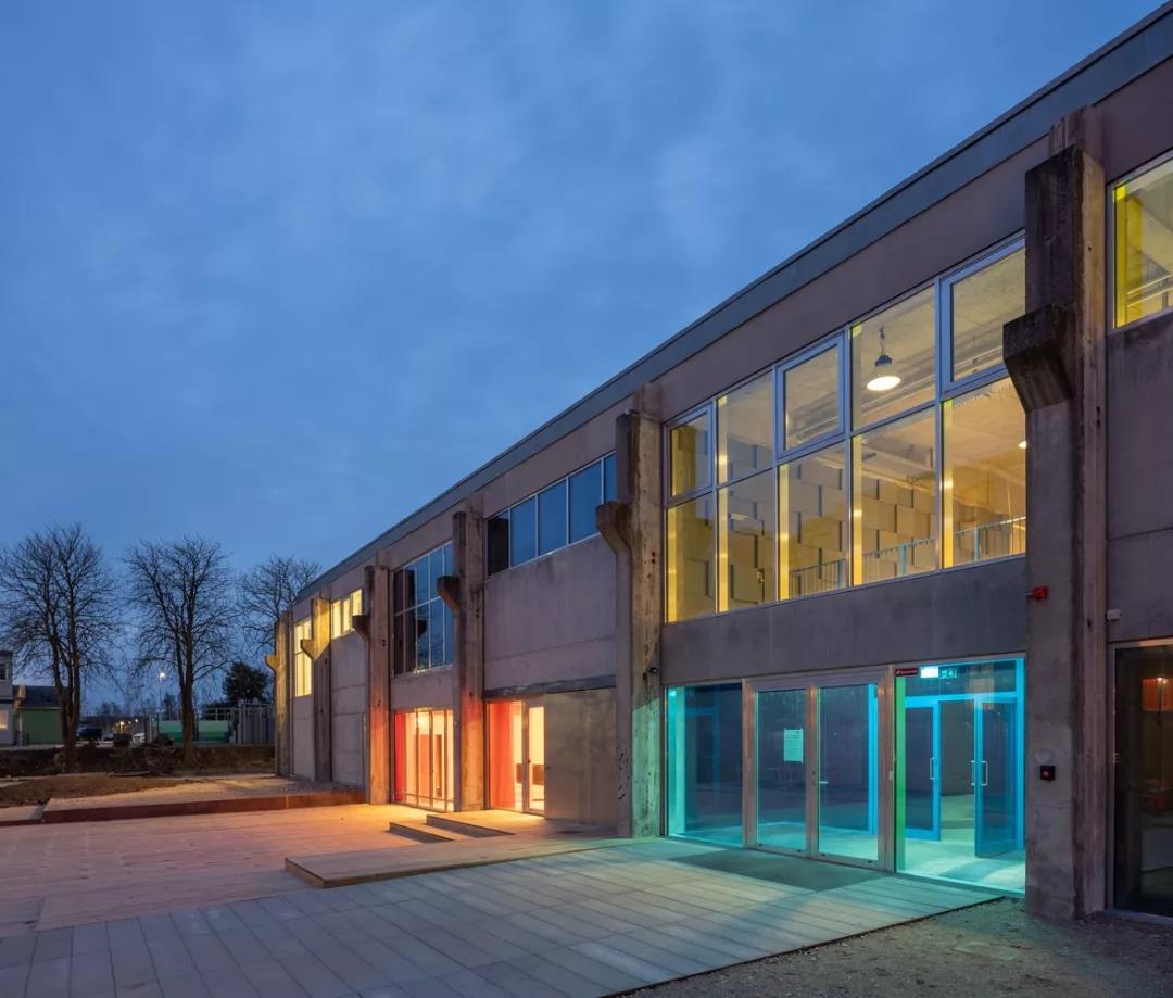 教學(xué)樓坐落在一個(gè)前混凝土工廠里,保留了原有結(jié)構(gòu)中的柱子和屋頂,重新設(shè)計(jì)了墻和室內(nèi)環(huán)境。該設(shè)計(jì)基于“盒子中的盒子”(box-in-a-box)的概念:五顏六色的模塊填滿了倉庫般的主建筑,并圍繞著橫跨建筑兩側(cè)的中央梁柱排列。沿著這條路線可達(dá)一個(gè)木制的階梯型講壇,它將作為學(xué)校的公共中心。