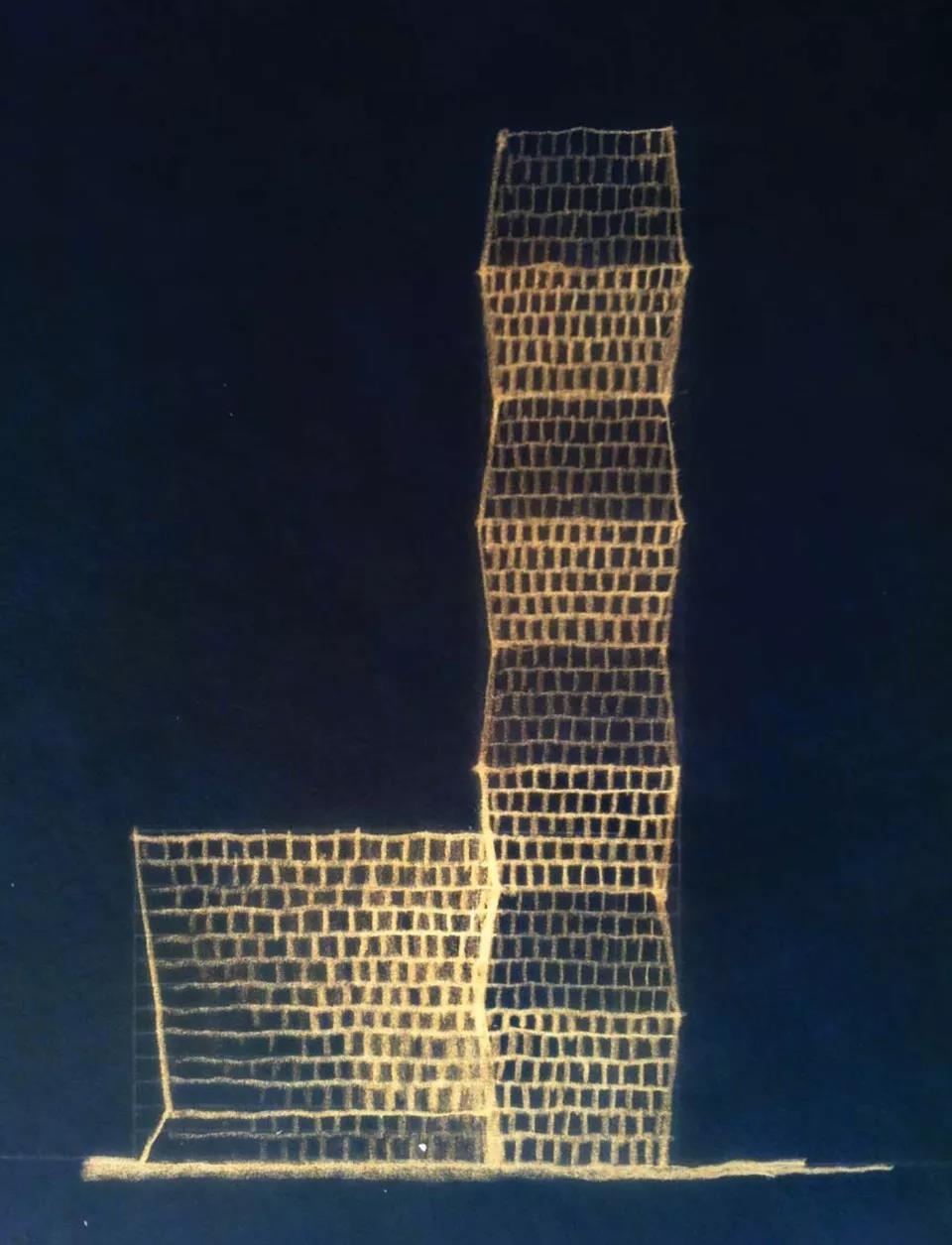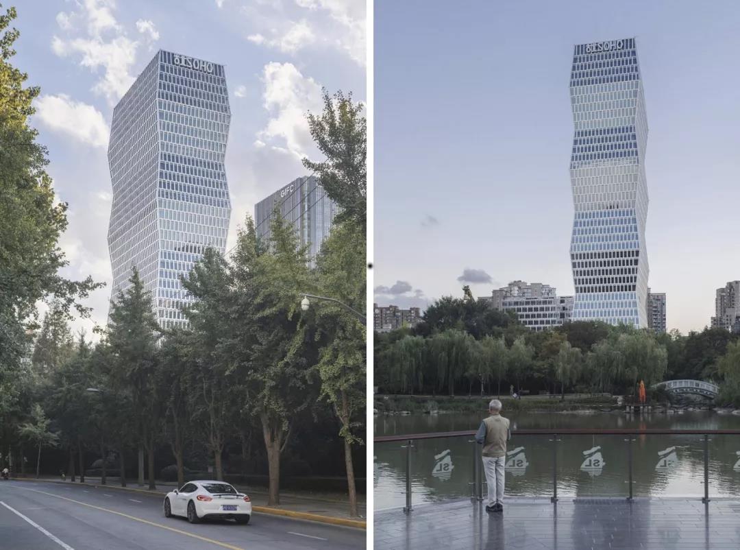 建筑采用波狀方尖塔造型,對角傾斜的曲折輪廓