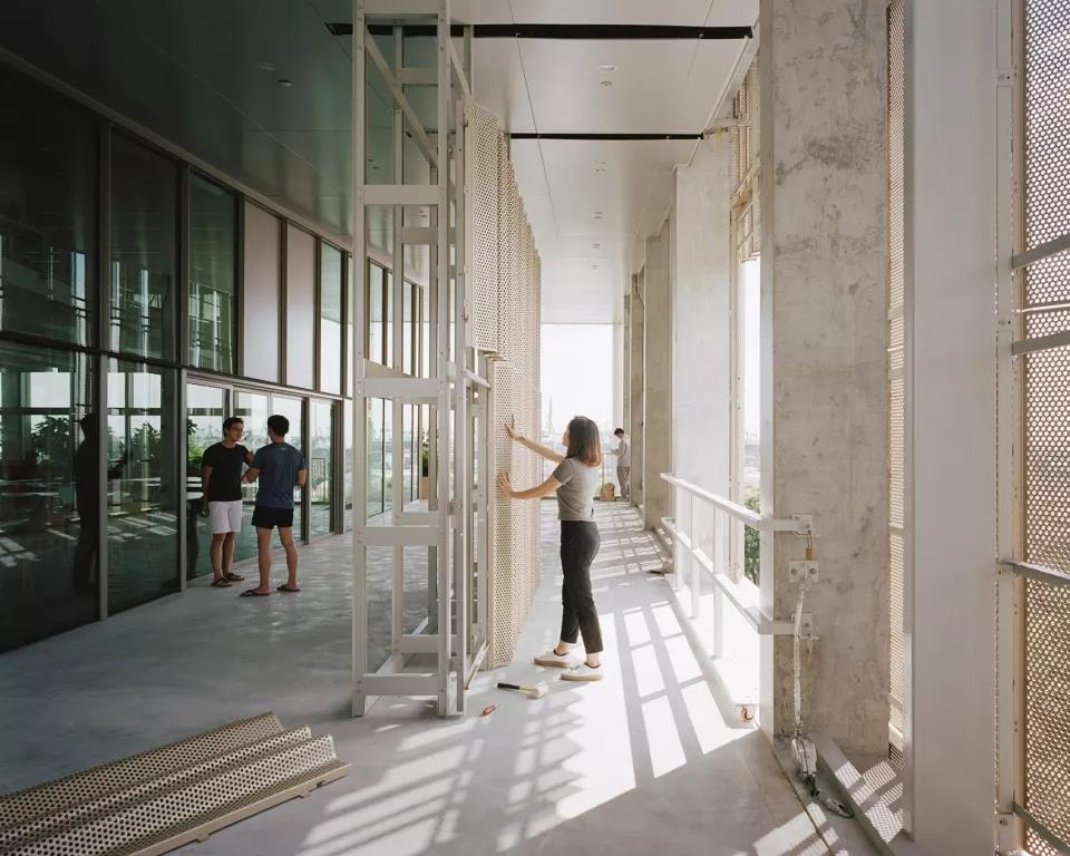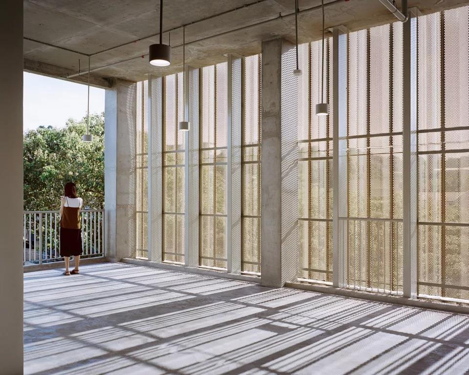 第四個空間位于東、西兩側幕墻的后方,用于樣品和模型制作。波紋穿孔鋁板緩和了東部和西部的強烈陽光,同時也具有可拆卸性,允許學生和研究人員測試建筑本身的各種立面系統。