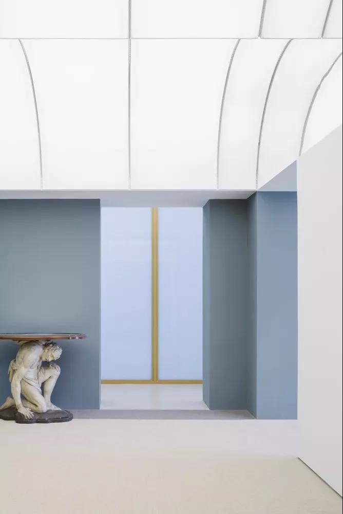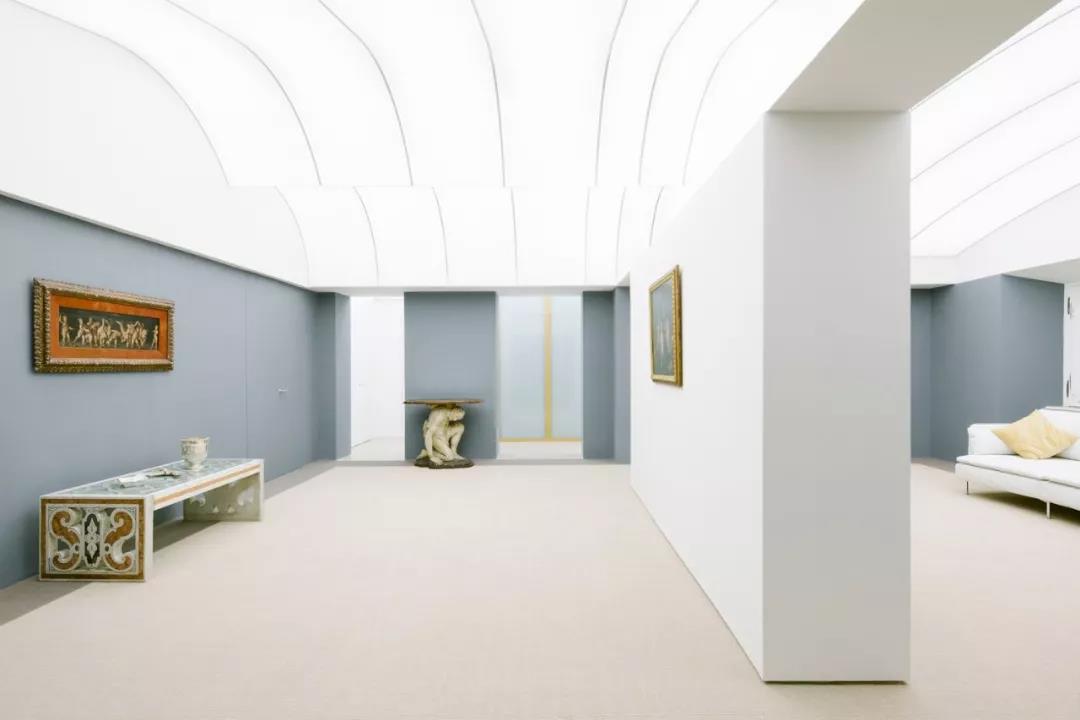 宮殿的巴洛克風格表現和這個項目之間的關系僅僅是空間上的,因為加建是相當輕巧的,幾乎沒有任何風格或瑣碎的意義。由抽象的白色表面和柔和的漫射燈光組合而成的懸掛式背景,為也只的收藏品和畫作提供了一個無聲的背景。通過使用反射拱頂的鏡子,使觀者改變了對砌體承重墻的感知,進一步清晰地表達了空間。這就沿著采光井向規則的空間中引入了一種張力。