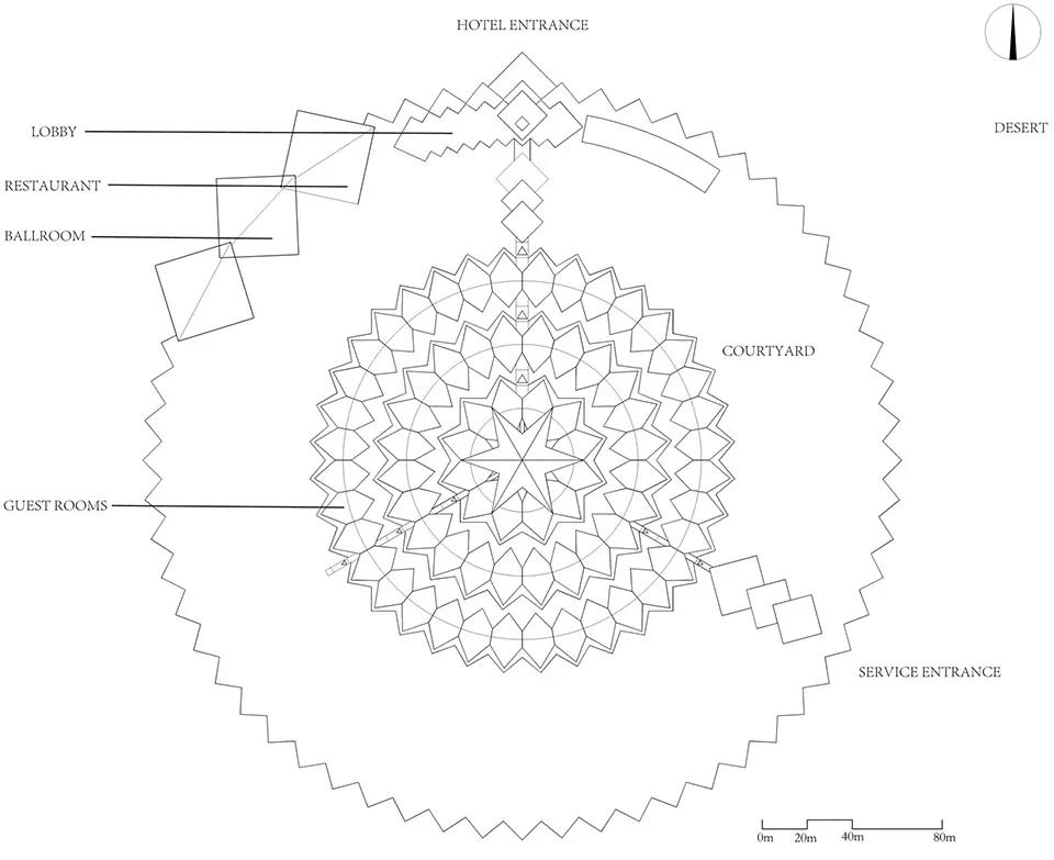 通過類似的手法,建筑對比使用科技手段帶來的舒適性擁有更低能耗。蓮花的形式源自浩瀚沙漠中沙丘的形式,同時考慮到沙漠化,日曬,風荷載及雨水收集的相關因素。