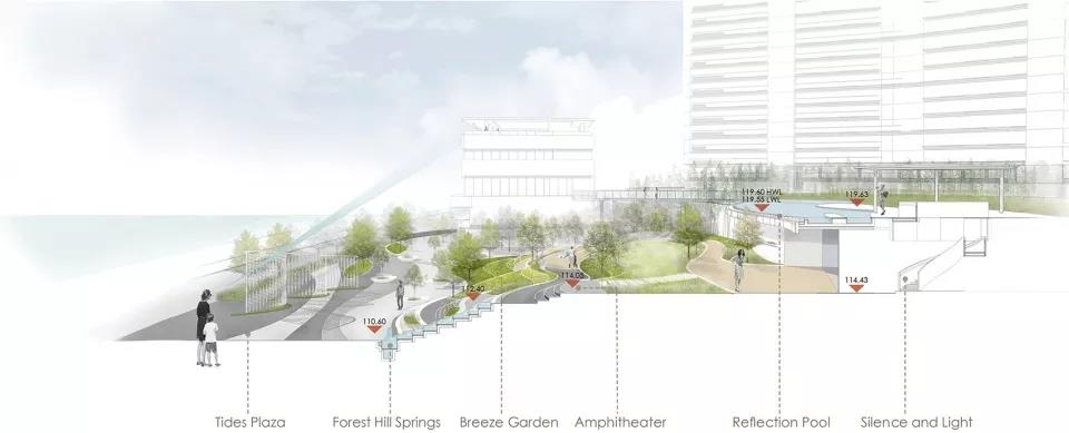 訪客空間體驗(yàn)從潮汐廣場(chǎng)開(kāi)始,一個(gè)波浪形式的聚會(huì)空間。地面的芝麻黑、芝麻灰、芝麻白花崗巖組合形式,形成閃亮湖面的一種微妙映畫(huà)。