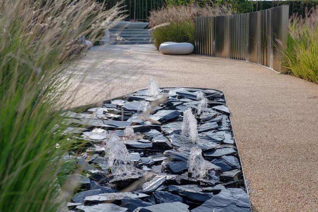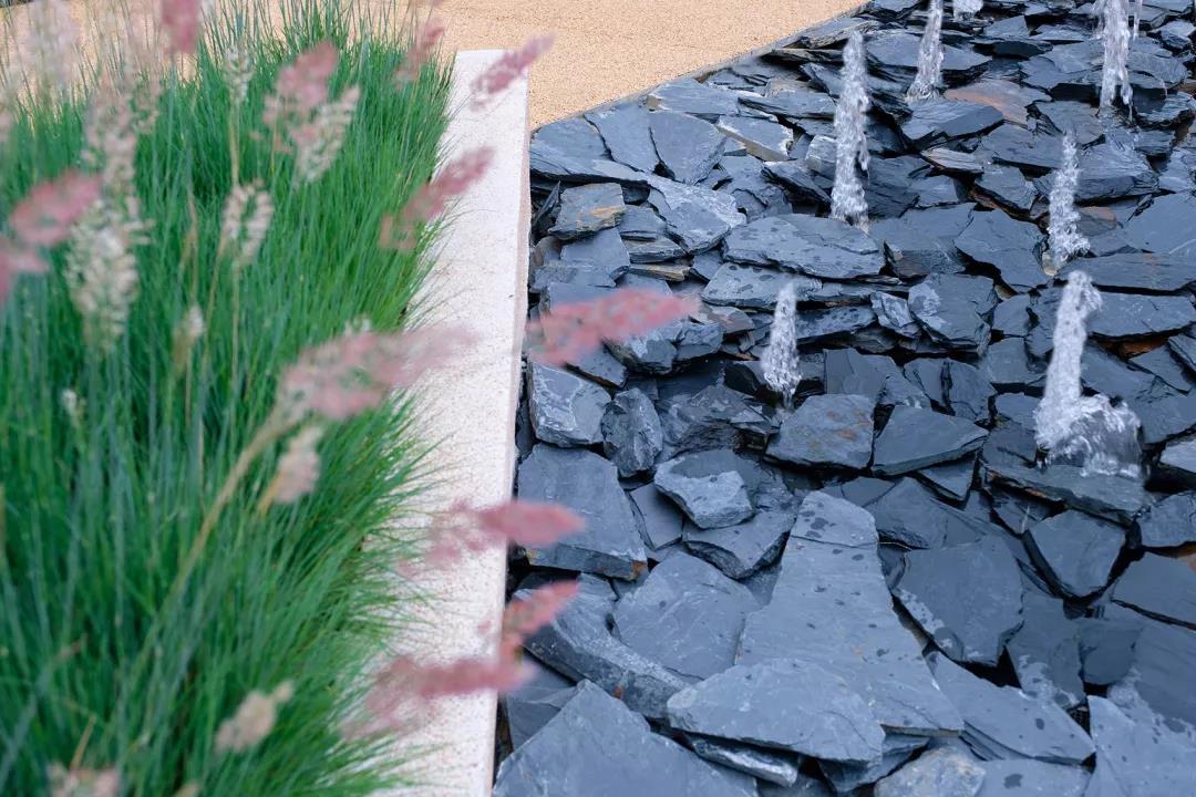 深灰色板巖噴泉,成為微風(fēng)花園空間轉(zhuǎn)換處的視覺(jué)焦點(diǎn)