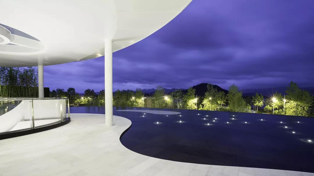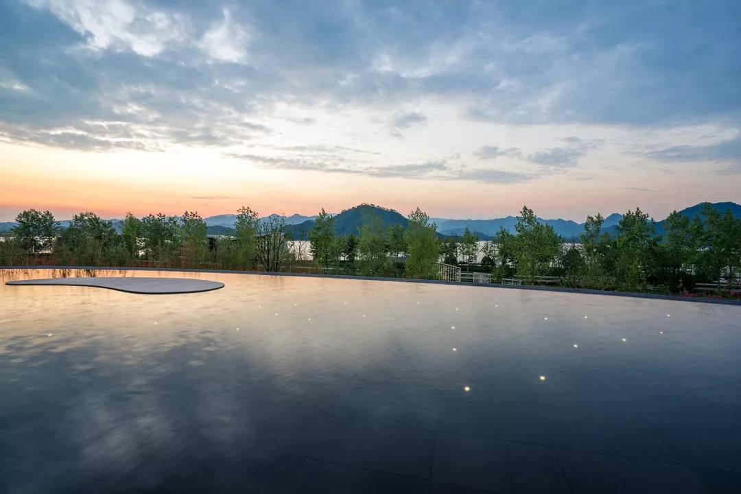 無(wú)邊界池底與遠(yuǎn)處的湖泊和山脈融為一體,池底的閃爍“星空”喚起了“水下古村落”的詩(shī)意形象,回憶起千島湖獨(dú)特而多愁的歷史。