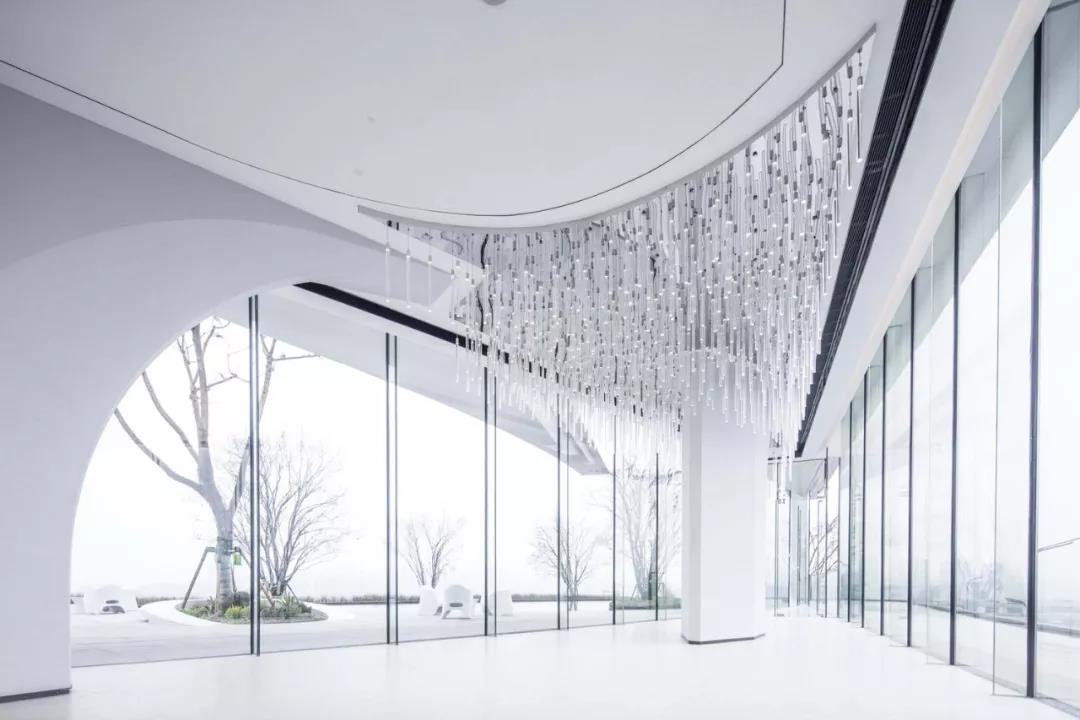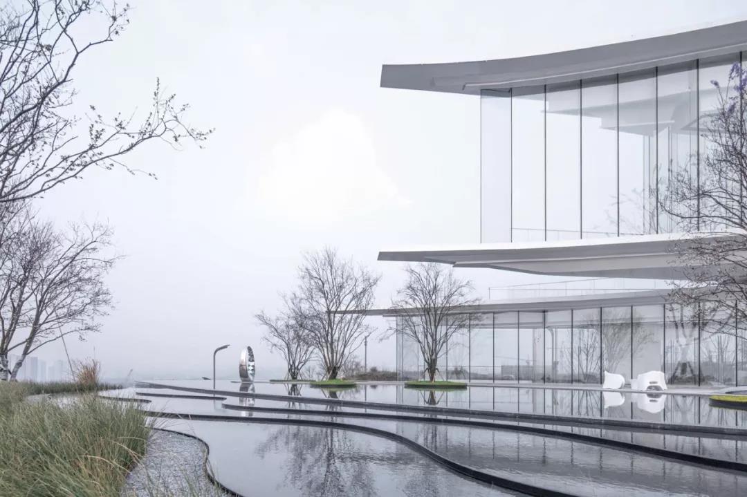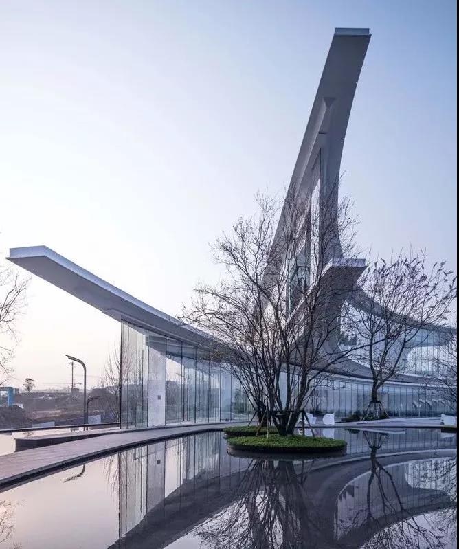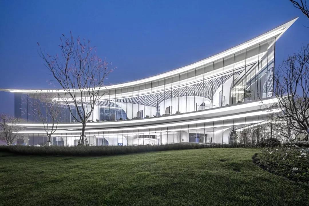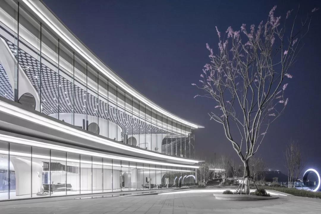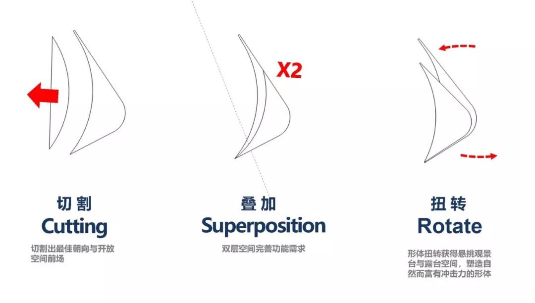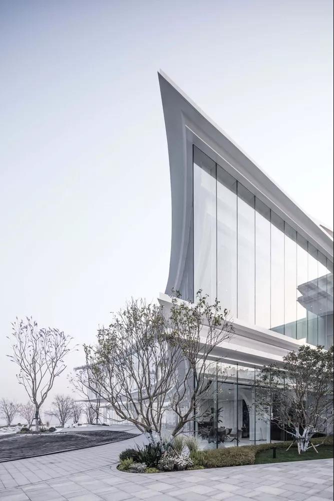 有限的設計語言被放大為懸崖、江灣、夕陽、和山形的運用:建筑的整體形態復印江灣和山體的走向,用一條簡潔的曲線,塑造空中一道灣流。三角形的邊角地塊也因為一條弧形的切割,而表現出明確的方向性。