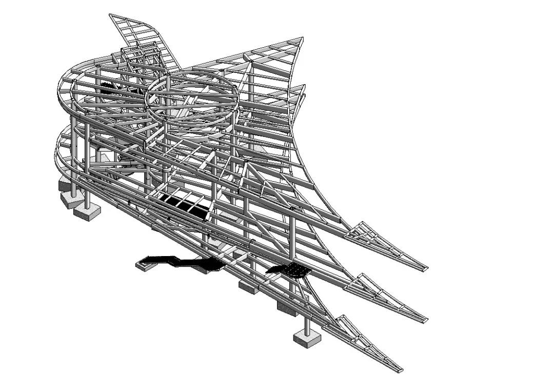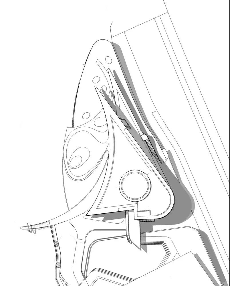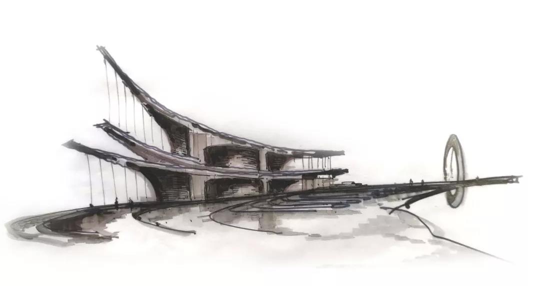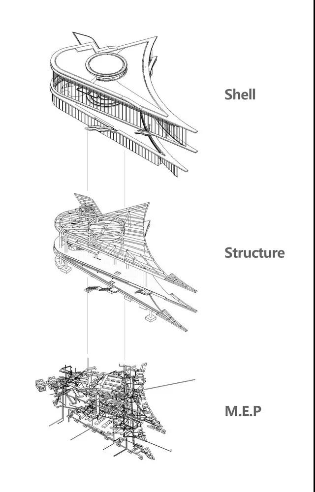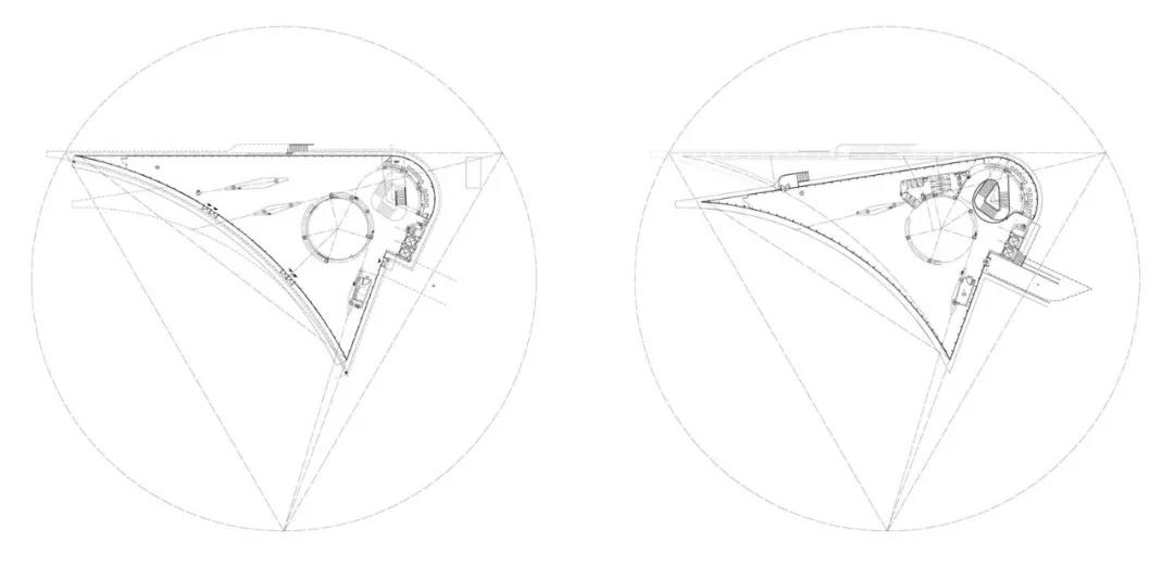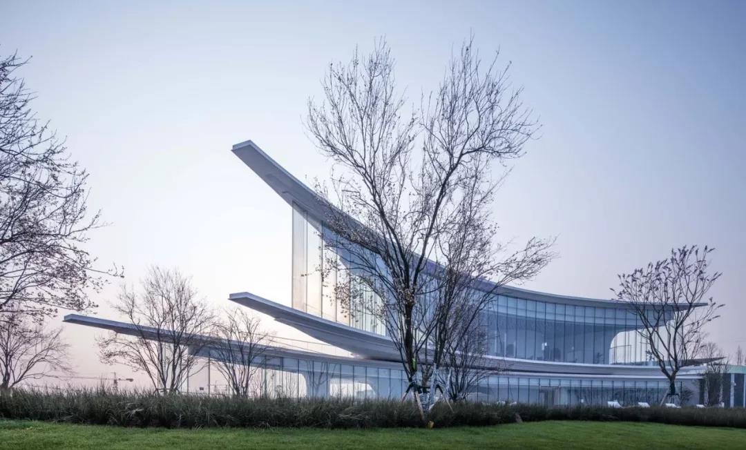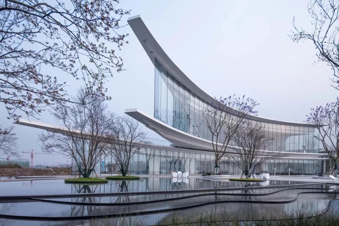 有限的設計語言被放大為懸崖、江灣、夕陽、和山形的運用:建筑的整體形態復印江灣和山體的走向,用一條簡潔的曲線,塑造空中一道灣流。三角形的邊角地塊也因為一條弧形的切割,而表現出明確的方向性。