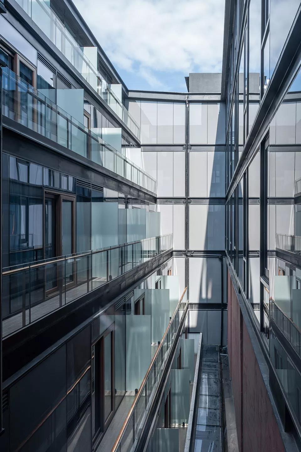 被保留的“倉”與疊加其上的“閣”并置,形成強(qiáng)烈的新舊對比。同時(shí),“倉”的局部增加了金屬雨篷、室外樓梯等新構(gòu)件,“閣”則在玻璃和金屬的基礎(chǔ)上局部使用木材等具有溫暖感和生活氣息的材料,使“倉閣”在人工與自然、工業(yè)與居住、歷史與未來之間實(shí)現(xiàn)一種復(fù)雜微妙的平衡。