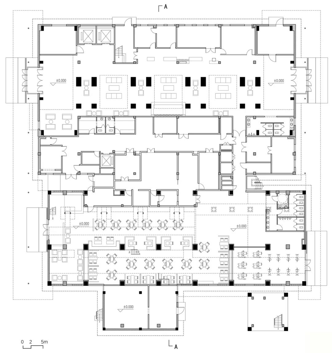 設(shè)計(jì)過程中,建筑師與結(jié)構(gòu)工程師密切配合,對原建筑進(jìn)行全面的結(jié)構(gòu)檢測,確定了“拆除、加固、保留”相結(jié)合的結(jié)構(gòu)處理方案;使用粒子噴射技術(shù)對需保留的涂料外墻進(jìn)行清洗,在清除污垢的同時(shí)保留了數(shù)十年形成的歲月痕跡和歷史信息。