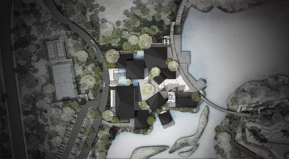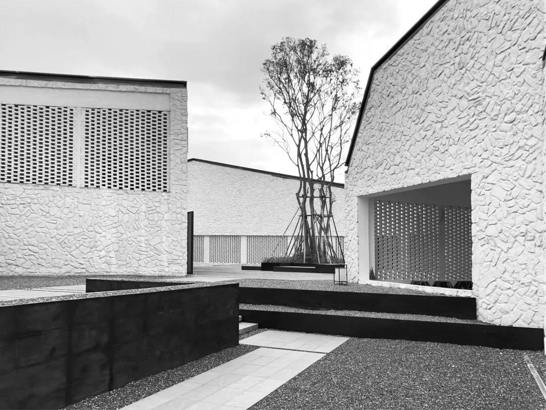 濕地接待中心,設計為兩面臨水,一面靠山。建筑的平面布局,形成類似傳統嶺南鄉村聚落的形態意向,中間是一個圍合的院落。屋頂采用變化的折坡帶給建筑群體更強的雕塑感。景觀設計主要圍繞中庭和周邊界面展開,采用自然過渡的形式處理臨水和臨山兩個側立面,結合簡約的鋪裝襯托建筑空間的硬朗和純粹,同時完整保持了圓形棧道的交通銜接功能。
