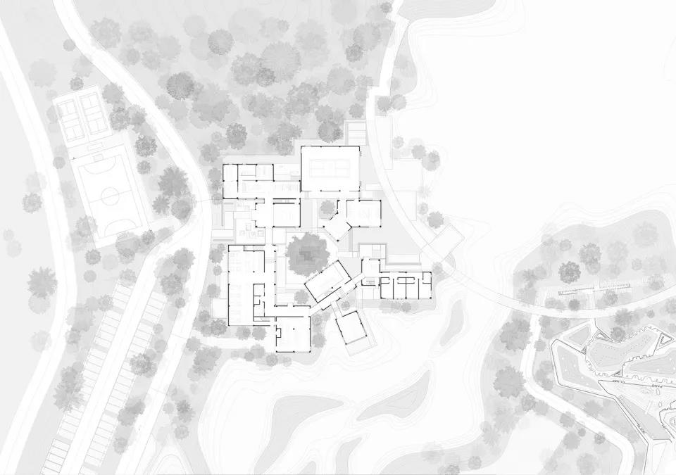 建筑的聚合策略,包含兩個層面的意思。第一,環聚各大建筑節點。第二,鄉村聚落的轉繹重生。設計結合傳統嶺南鄉村聚落意向,利用有機形態的合與轉折,組合形成了一個自然的聚落空間。