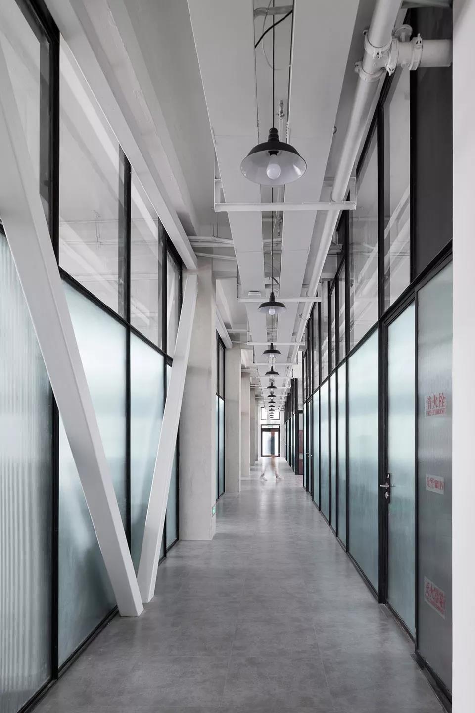 4號樓原為三層,底層層高7米,上面兩層分別是4.5米,我們將底層變成了躍層,對外出租,上面兩層隔成獨立辦公室。為了讓內廊明亮,走廊兩側的隔斷用了壓花玻璃,同時,所有隔墻在2.2米高度以上都用透明玻璃,使每個房間能感受到更多的空間。我們希望暴露原有的廠房結構,不做吊頂,設備只能露明,所以一開始就要控制所有管線的排布及穿過玻璃的方式。