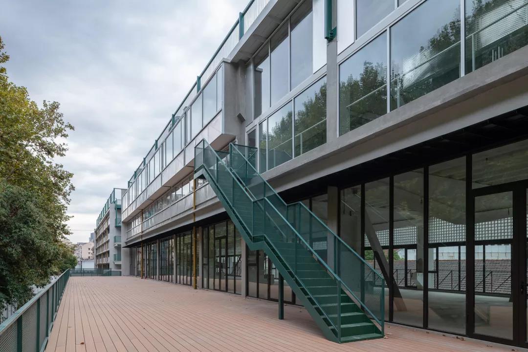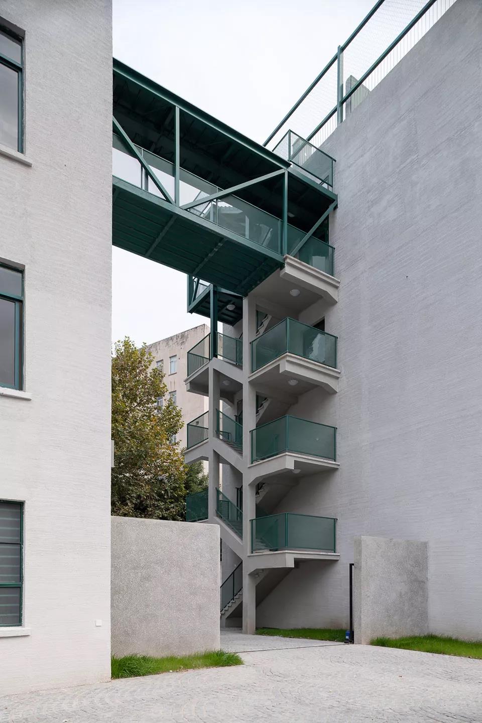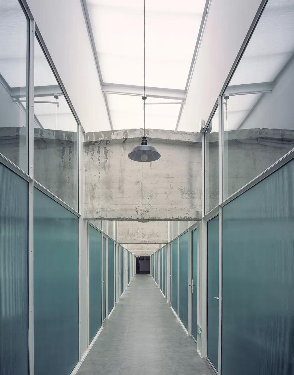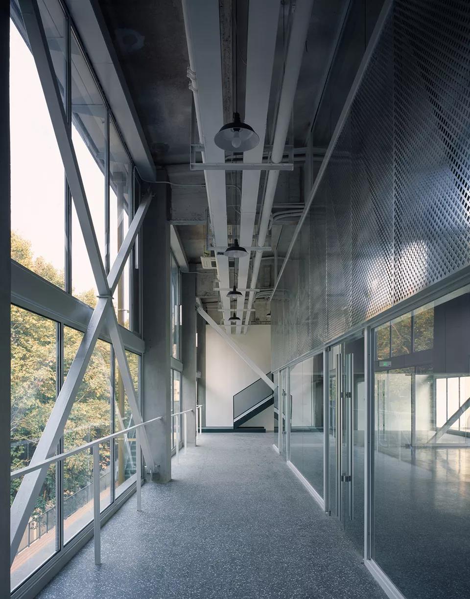 最后,我們用廊橋把兩個庫房頂層辦公空間連接在了一起。