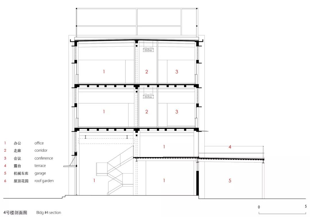 5號樓原為兩層,底層層高9.9米,第二層層高5.7米。我們將底層分割成5.3米和4.6米兩層,供租賃使用。二層東邊的6跨,在局部做了插層,下層層高2.3米,用作資料檔案庫,上面用作辦公室。西邊4跨保持原來的層高,作為一個完整的大空間,供會議和活動使用。為了達到任務書規定的獨立小間辦公的面積要求,插層的樓板做了出挑,立面上呈現為一個個突出的盒子。站在插層高度,離原來的大梁很近,為了減輕大梁的壓抑感,我們把內廊向上延伸,并把頂部做成天窗,所有需要在樓內環通的設備管線也整合進了這個天窗的側壁。