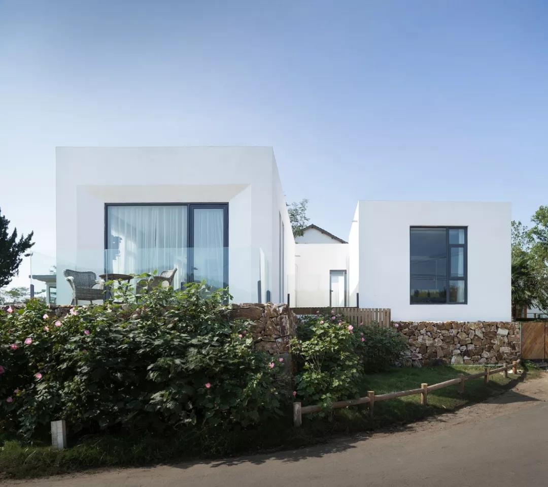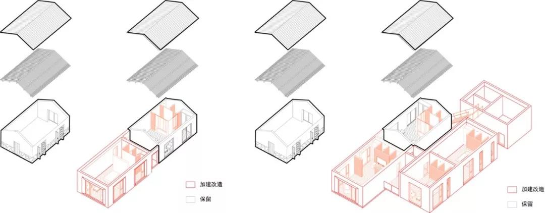 改造策略可總結(jié)為“四原”方針:即保持“原址、原尺度、原地貌、原材質(zhì)”,進行重建。西側(cè)原來紅磚側(cè)院保留,重建一組帶院子的套房;正房部分改為接待廳,坡屋頂廂房前增加一組白色平屋頂房間;正房后方新建一棟二層白色坡屋頂客房,一樓餐廳廚房,二樓客房。客廳后原有二層住宅保留,改造為客房;二層東側(cè)原有輔助房屋原樣修復,改造出4間套房。