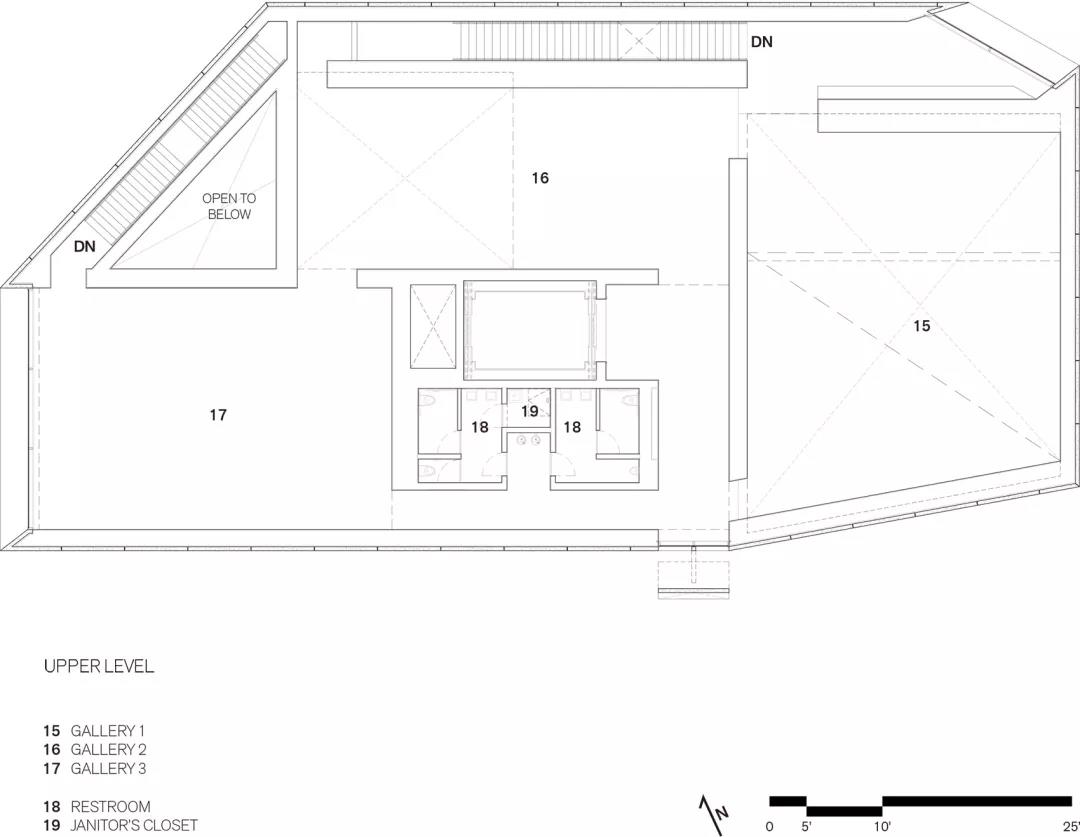 二層平面圖:內部空間設計為環形結構,大廳樓梯引導人們抵達二層俯瞰Chris公園的窗邊