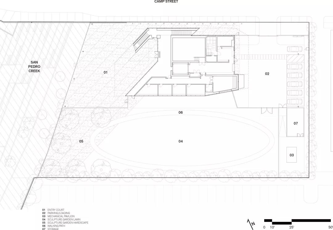參觀者從俯瞰Chris公園的窗邊穿過三個展覽空間,每個空間內部都有一個朝向不同的采光塔,將圣安東尼奧耀眼的陽光調整過濾為內部柔和的光線。在經過最后一間展室向下回到大廳之前,參觀者能夠在這個區域看到整個入口廣場和San Pedro河,從大廳可以到達建筑南側的室外雕塑花園。