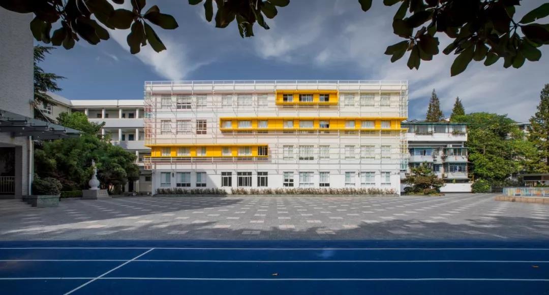 濮家校區是濮家小學教育集團歷史最久的一個校區,最老的一幢樓是在上世紀80年代建成的。該學校有30年的歷史了,濮家校區是濮家教育集團最老的校區,校方希望能通過翻修給校區新的生命力。濮家校區是體育傳統名校,所以我們和學校都想把運動的元素融入操場當中,在其后的方案中出現了高飽和度的顏色和不同形式的線條和幾何圖形。