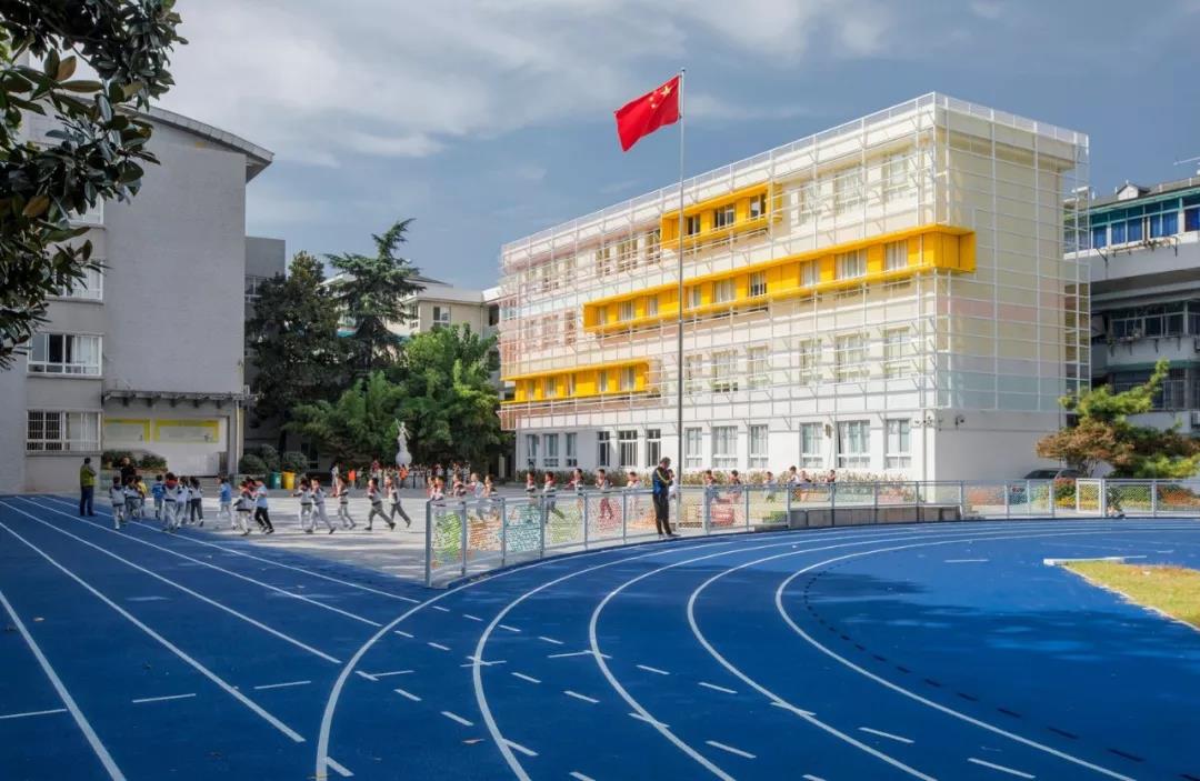 濮家校區是體育傳統名校,所以我們和學校都想把運動的元素融入操場當中,在建筑和運動場地設計中出現了高飽和度的顏色和不同形式的線條和幾何圖形。因時而興,乘勢而變,隨時代而行。90年代的校園建設對美學設計要求普遍不高,伴隨懷舊聲,眾多的校園逐漸老化,孩子們將童年大部分時光留在了校園,如何帶給孩子們一份童趣和天真用來溫存逝去的回憶是校方和設計者都在思考的一個問題。
