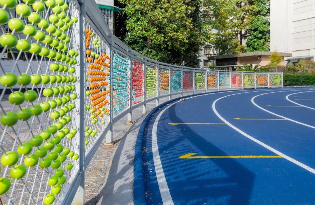 運動場地上改變了普遍單調的操場的涂裝規則,保持操場標線功能的同時提取其中固有的規律性元素進行圖形化延展處理,將對比的色彩植入其中形成強烈的“碰撞”,讓孩子們在運動中感受競技體育的樂趣。