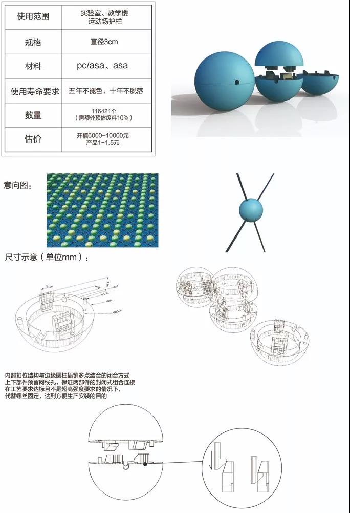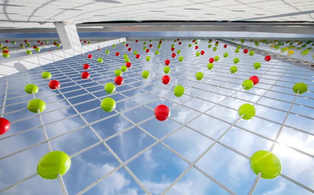 球體所附屬的網狀構筑物與建筑立面呈四十五度夾角關系,既不對教室的光亮造成影響,在視覺層面上又會呈現色彩的交織、融合、疊加、分解的動態視覺感受,使人在空間運動過程中感受色彩的變化流動。這些球體相互連接又相互不同,好比全球互聯下的今天人們交織鏈接在一起。